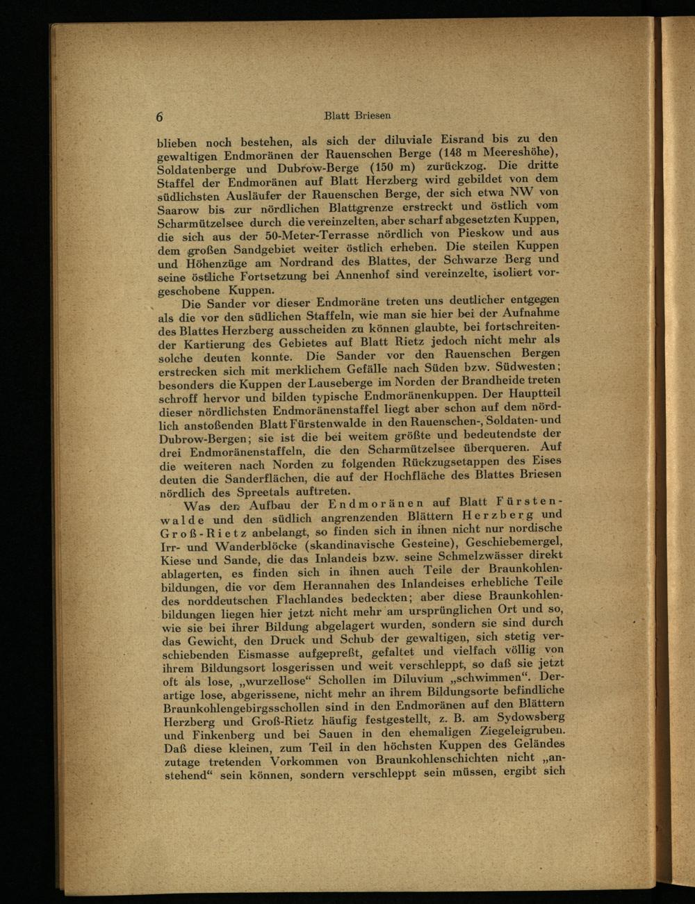 Was den Aufbau der Endmoränen auf Blatt Fü rsten- walde und den südlich angrenzenden Blättern Herzberg und Groß-Rietz anbelangt, so finden sich in ihnen nicht nur nordische Irr- und Wanderblöcke (skandinavische Gesteine), Geschiebemergel, Kiese und Sande, die das Inlandeis bzw. seine Schmelzwässer direkt ablagerten, es finden sich in ihnen auch Teile der Braunkohlenbildungen, die vor dem Herannahen des Inlandeises erhebliche Teile des norddeutschen Flachlandes bedeckten; aber diese Braunkohlenbildungen liegen hier jetzt nicht mehr am ursprünglichen Ort und so, wie sie bei ihrer Bildung abgelagert wurden, sondern sie sind durch das Gewicht, den Druck und Schub der gewaltigen, sich stetig verschiebenden Eismasse aufgepreßt, gefaltet und vielfach völlig von ihrem Bildungsort losgerissen und weit verschleppt, so daß sie jetzt oft als lose, „wurzellose“ Schollen im Diluvium „schwimmen“. Derartige lose, abgerissene, nicht mehr an ihrem Bildungsorte befindliche Braunkohlengebirgsschollen sind in den Endmoränen auf den Blättern Herzberg und Groß-Rietz häufig festgestellt, z. B. am Sydowsberg und Finkenberg und bei Sauen in den ehemaligen Ziegeleigruben. Daß diese kleinen, zum Teil in den höchsten Kuppen des Geländes zutage tretenden Vorkommen von Braunkohlenschichten nicht „anstehend“ sein können, sondern verschleppt sein müssen, ergibt sich