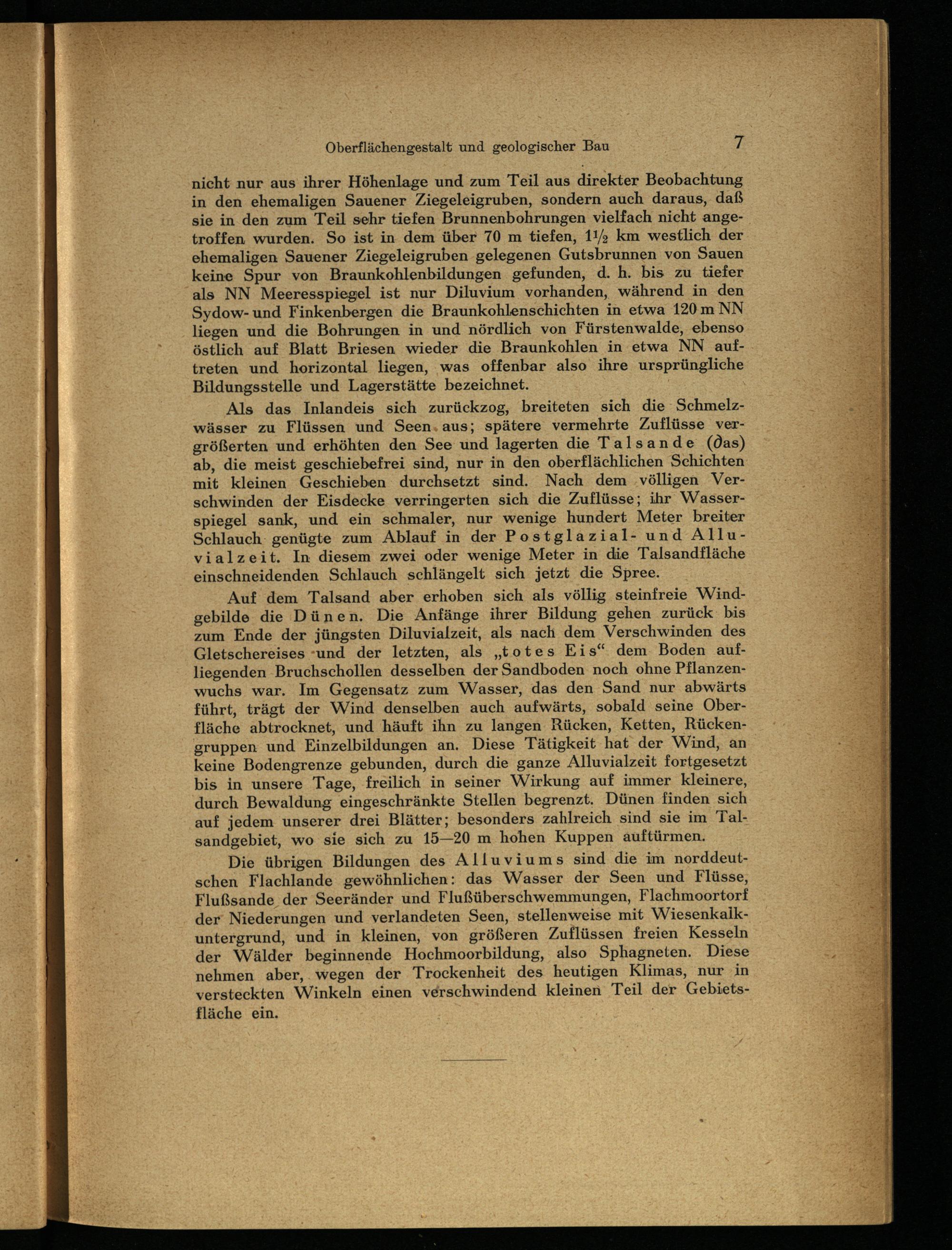 nicht nur aus ihrer Höhenlage und zum Teil aus direkter Beobachtung in den ehemaligen Sauener Ziegeleigruben, sondern auch daraus, daß sie in den zum Teil sehr tiefen Brunnenbohrungen vielfach nicht angetroffen wurden. So ist in dem über 70 m tiefen, I 1/2 km westlich der ehemaligen Sauener Ziegeleigruben gelegenen Gutsbrunnen von Sauen keine Spur von Braunkohlenbildungen gefunden, d. h. bis zu tiefer als NN Meeresspiegel ist nur Diluvium vorhanden, während in den Sydow-und Finkenbergen die Braunkohlenschichten in etwa 120 m NN liegen und die Bohrungen in und nördlich von Fürstenwalde , ebenso östlich auf Blatt Briesen wieder die Braunkohlen in etwa NN auf- treten und horizontal liegen, was offenbar also ihre ursprüngliche Bildungsstelle und Lagerstätte bezeichnet.