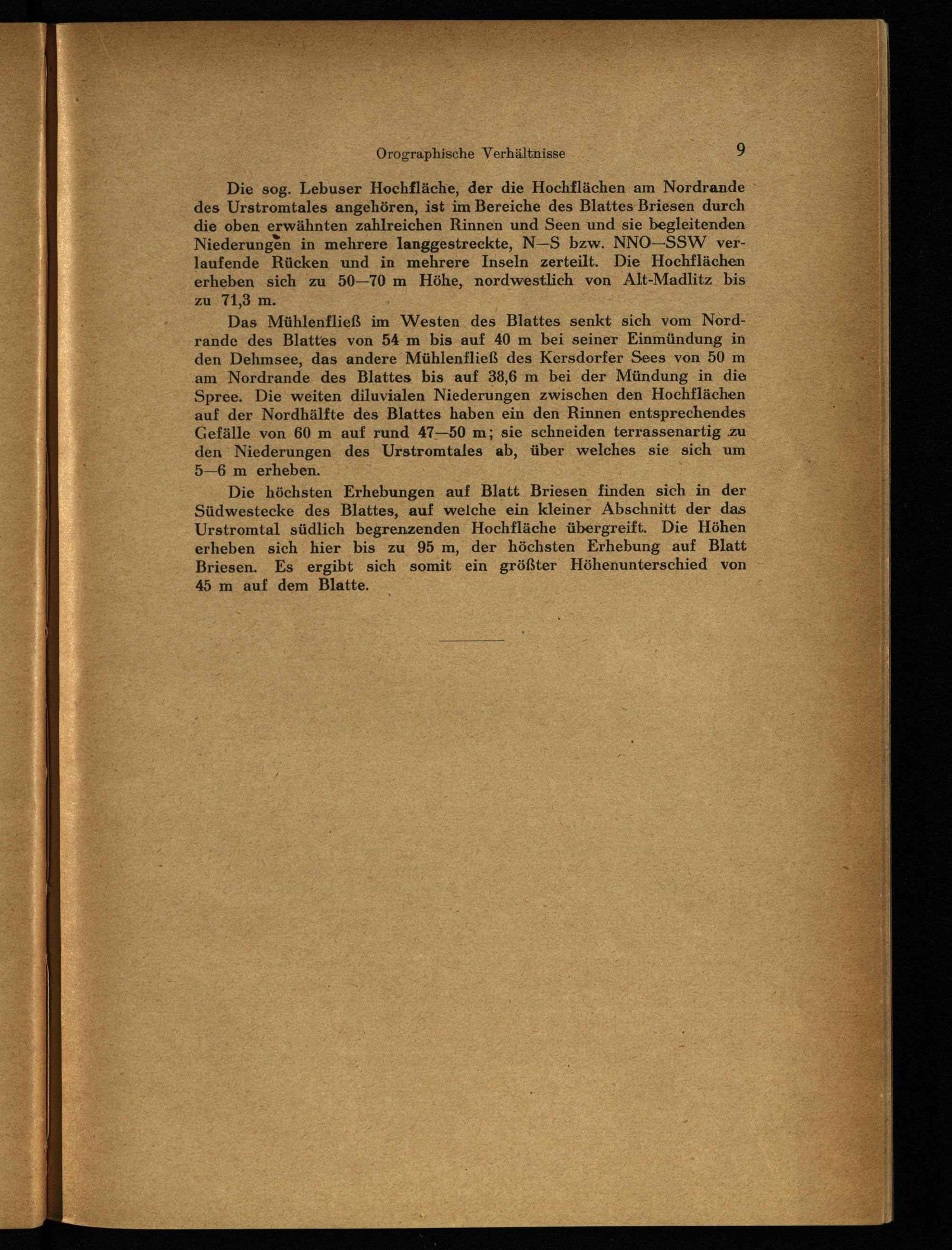 Die sog. Lebuser Hochfläche, der die Hochflächen am Nordrande des Urstromtales angehören, ist im Bereiche des Blattes Briesen durch die oben erwähnten zahlreichen Rinnen und Seen und sie begleitenden Niederungen in mehrere langgestreckte, N—S bzw. NNO—SSW verlaufende Rücken und in mehrere Inseln zerteilt. Die Hochflächen erheben sich zu 50—70 m Höhe, nordwestlich von Alt-Madlitz bis zu 71,3 m.