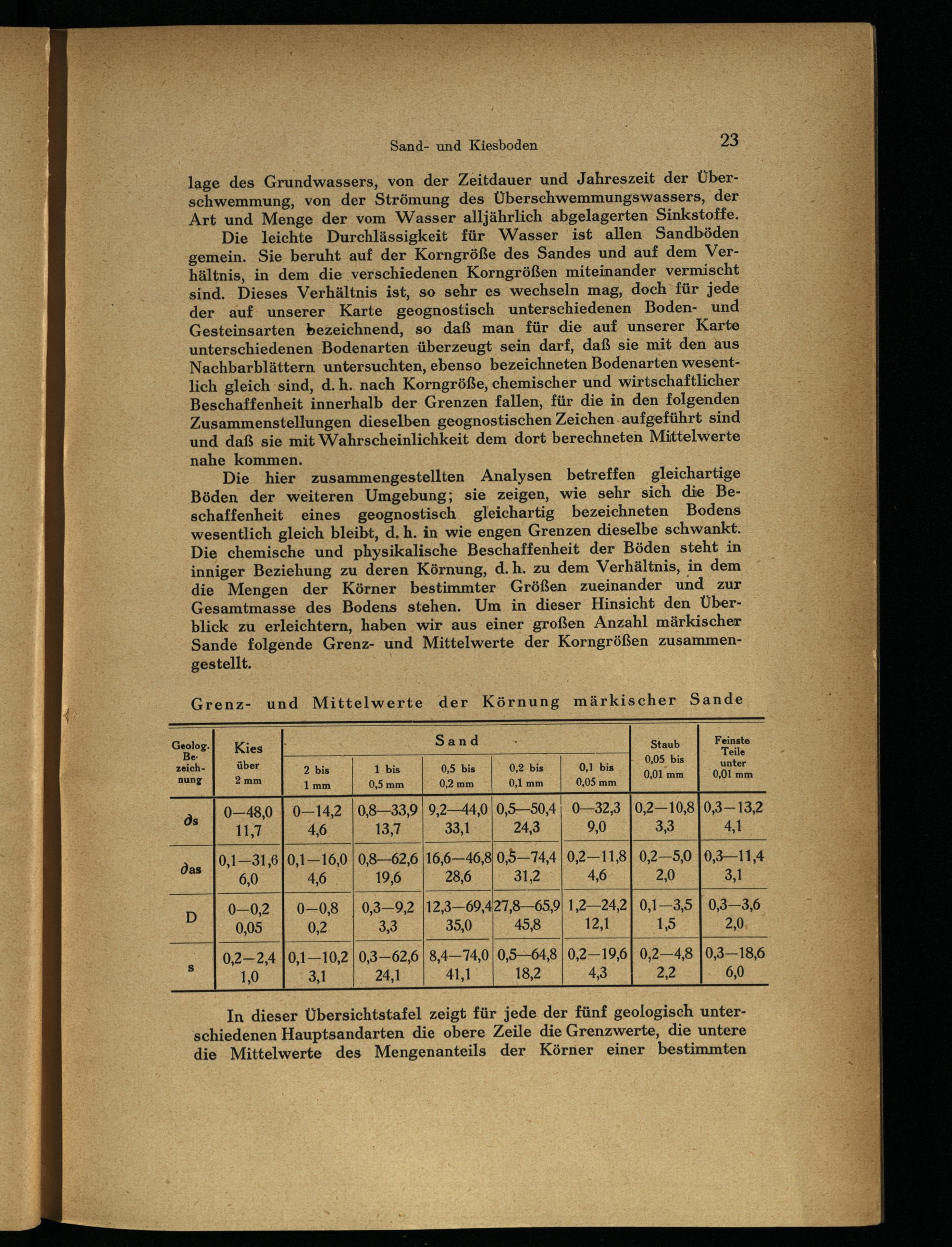 Die leichte Durchlässigkeit für Wasser ist allen Sandböden gemein. Sie beruht auf der Korngröße des Sandes und auf dem Verhältnis, in dem die verschiedenen Korngrößen miteinander vermischt sind. Dieses Verhältnis ist, so sehr es wechseln mag, doch für jede der auf unserer Karte geognostisch unterschiedenen Boden- und Gesteinsarten bezeichnend, so daß man für die auf unserer Karte unterschiedenen Bodenarten überzeugt sein darf, daß sie mit den aus Nachbarblättern untersuchten, ebenso bezeichneten Bodenarten wesentlich gleich sind, d. h. nach Korngröße, chemischer und wirtschaftlicher Beschaffenheit innerhalb der Grenzen fallen, für die in den folgenden Zusammenstellungen dieselben geognostischen Zeichen aufgeführt sind und daß sie mit Wahrscheinlichkeit dem dort berechneten Mittelwerte nahe kommen.