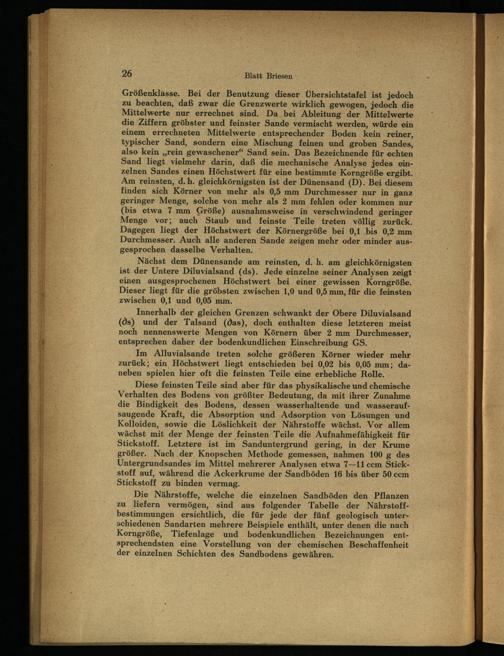 Diese feinsten Teile sind aber für das physikalische und chemische Verhalten des Bodens von größter Bedeutung, da mit ihrer Zunahme die Bindigkeit des Bodens, dessen wasserhaltende und wasserauf- saugende Kraft, die Absorption und Adsorption von Lösungen und Kolloiden, sowie die Löslichkeit der Nährstoffe wächst. Vor allem wächst mit der Menge der feinsten Teile die Aufnahmefähigkeit für Stickstoff. Letztere ist im Sanduntergrund gering, in der Krume größer. Nach der Knopschen Methode gemessen, nahmen 100 g des Untergrundsandes im Mittel mehrerer Analysen etwa 7—11 ccm Stickstoff auf, während die Ackerkrume der Sandböden 16 bis über 50 ccm Stickstoff zu binden vermag.