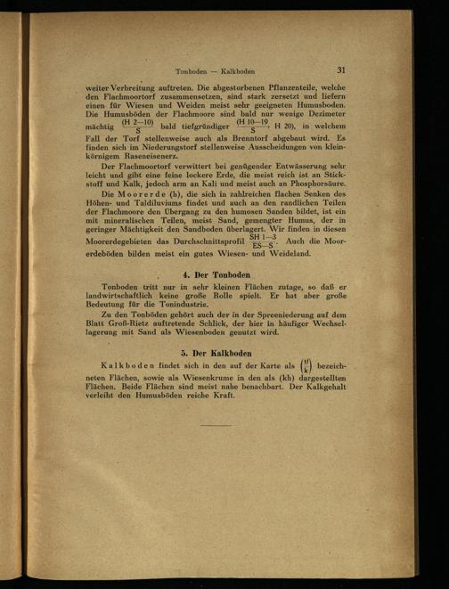Die Moorerde (h), die sich in zahlreichen flachen Senken des Höhen- und Taldiluviums findet und auch an den randlichen Teilen der Flachmoore den Übergang zu den humosen Sanden bildet, ist ein mit mineralischen Teilen, meist Sand, gemengter Humus, der in geringer Mächtigkeit den Sandboden überlagert. Wir finden in diesen