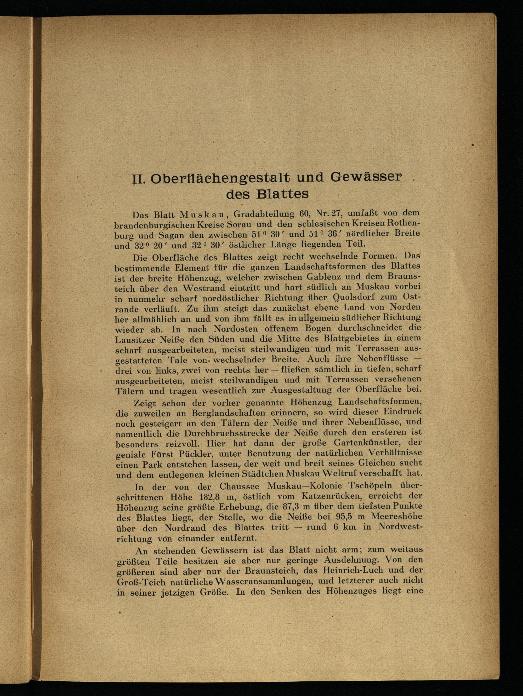 Die Oberfläche des Blattes zeigt recht wechselnde Formen. Das bestimmende Element für die ganzen Landschaftsformen des Blattes ist der breite Höhenzug, welcher zwischen Gablenz und dem Braunsteich über den Westrand eintritt und hart südlich an Muskau vorbei in nunmehr scharf nordöstlicher Richtung über Ouolsdorf zum Ostrande verläuft. Zu ihm steigt das zunächst ebene Land von Norden her allmählich an und von ihm fällt es in allgemein südlicher Richtung wieder ab. In nach Nordosten offenem Bogen durchschneidet die Lausitzer Neiße den Süden und die Mitte des Blattgebietes in einem scharf ausgearbeiteten, meist steilwandigen und mit Terrassen ausgestatteten Tale von-wechselnder Breite. Auch ihre Nebenflüsse — drei von links, zwei von rechts her — fließen sämtlich in tiefen, scharf ausgearbeiteten, meist steilwandigen und mit Terrassen versehenen Tälern und tragen wesentlich zur Ausgestaltung der Oberfläche bei.
