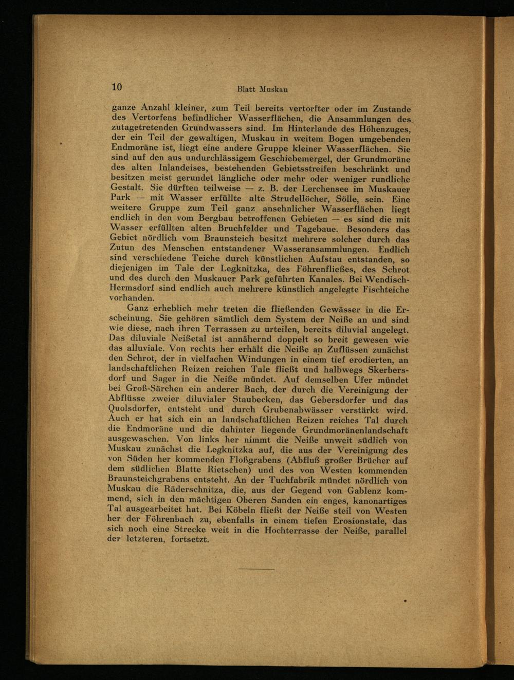 Ganz erheblich mehr treten die fließenden Gewässer in die Erscheinung. Sie gehören sämtlich dem System der Neiße an und sind wie diese, nach ihren Terrassen zu urteilen, bereits diluvial angelegt. Das diluviale Neißetal ist annähernd doppelt so breit gewesen wie das alluviale. Von rechts her erhält die Neiße an Zuflüssen zunächst den Schrot, der in vielfachen Windungen in einem tief erodierten, an landschaftlichen Reizen reichen Tale fließt und halbwegs Skerbers- dorf und Säger in die Neiße mündet. Auf demselben Ufer mündet bei Groß-Särchen ein anderer Bach, der durch die Vereinigung der Abflüsse zweier diluvialer Staubecken, das Gebersdörfer und das Quolsdorfer, entsteht und durch Grubenabwässer verstärkt wird. Auch er hat sich ein an landschaftlichen Reizen reiches Tal durch die Endmoräne und die dahinter liegende Grundmoränenlandschaft ausgewaschen. Von links her nimmt die Neiße unweit südlich von Muskau zunächst die Legknitzka auf, die aus der Vereinigung des von Süden her kommenden Floßgrabens (Abfluß großer Brücher auf dem südlichen Blatte Rietschen ) und des von Westen kommenden Braunsteichgrabens entsteht. An der Tuchfabrik mündet nördlich von Muskau die Räderschnitza, die, aus der Gegend von Gablenz kommend, sich in den mächtigen Oberen Sanden ein enges, kanonartiges Tal ausgearbeitet hat. Bei Köbeln fließt der Neiße steil von Westen her der Föhrenbach zu, ebenfalls in einem tiefen Erosionstale, das sich noch eine Strecke weit in die Hochterrasse der Neiße , parallel der letzteren, fortsetzt.