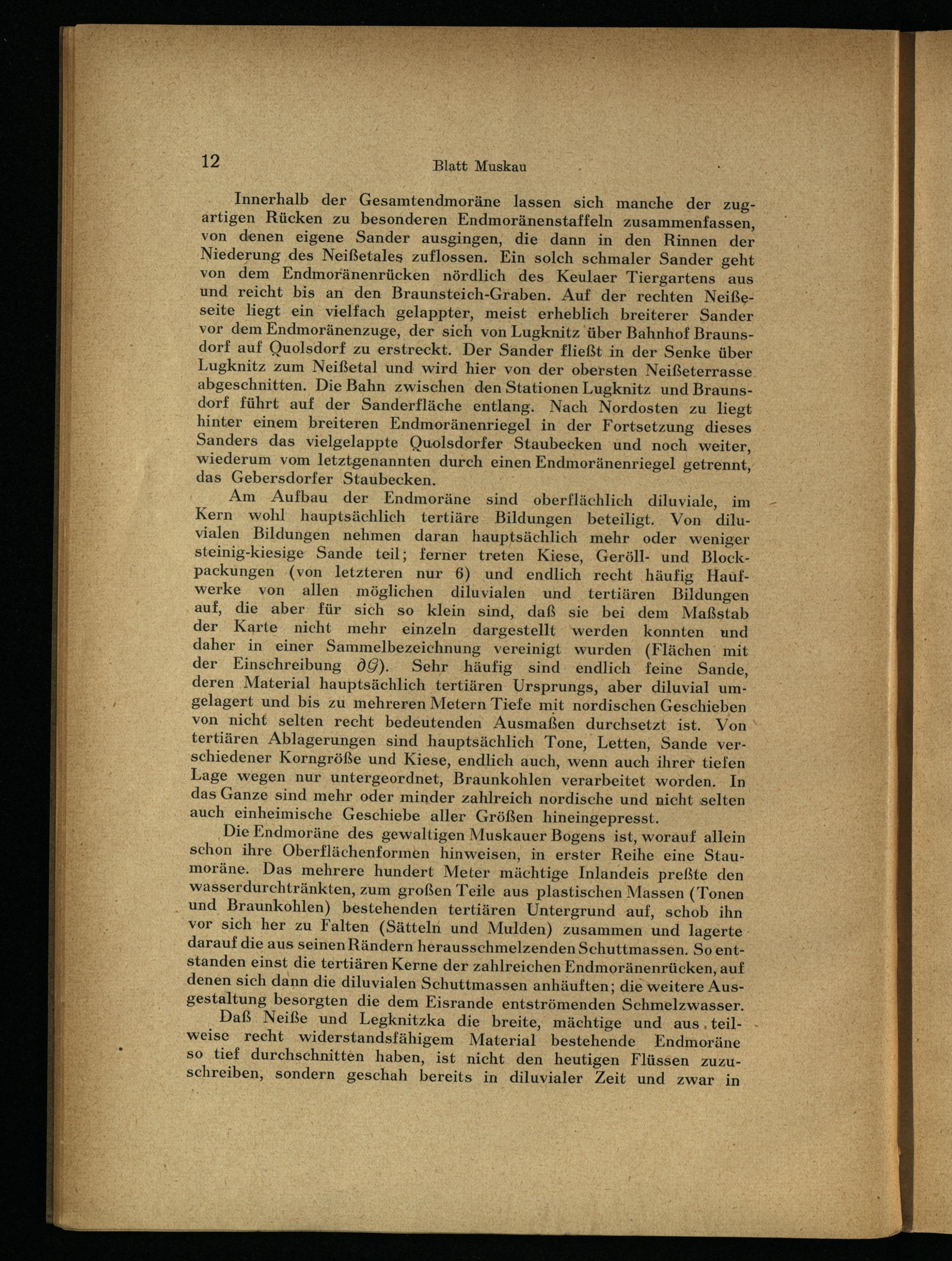 Die Endmoräne des gewaltigen Muskauer Bogens ist, worauf allein schon ihre Oberflächenformen hinweisen, in erster Reihe eine Staumoräne. Das mehrere hundert Meter mächtige Inlandeis preßte den wasserdurchtränkten, zum großen Teile aus plastischen Massen (Tonen und Braunkohlen) bestehenden tertiären Untergrund auf, schob ihn vor sich her zu Falten (Sätteln und Mulden) zusammen und lagerte darauf die aus seinen Rändern herausschmelzenden Schuttmassen. So entstanden einst die tertiären Kerne der zahlreichen Endmoränenrücken, auf denen sich dann die diluvialen Schuttmassen anhäuften; die weitere Ausgestaltung besorgten die dem Eisrande entströmenden Schmelzwasser.