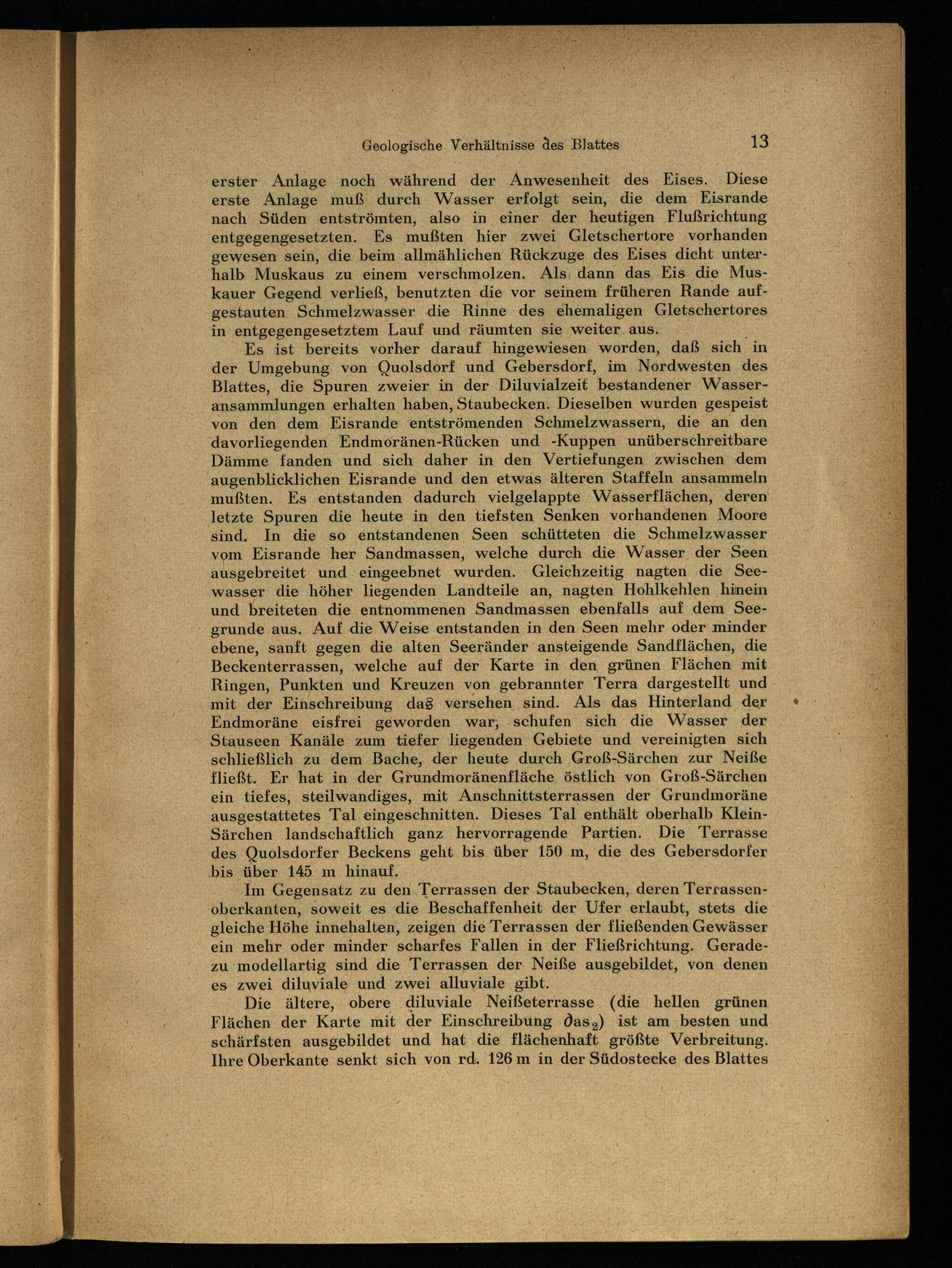 Es ist bereits vorher darauf hingewiesen worden, daß sich in der Umgebung von Quolsdorf und Gebersdorf , im Nordwesten des Blattes, die Spuren zweier in der Diluvialzeit bestandener Wasseransammlungen erhalten haben, Staubecken. Dieselben wurden gespeist von den dem Eisrande entströmenden Schmelzwassern, die an den davorliegenden Endmoränen-Rücken und -Kuppen unüberschreitbare Dämme fanden und sich daher in den Vertiefungen zwischen dem augenblicklichen Eisrande und den etwas älteren Staffeln ansammeln mußten. Es entstanden dadurch vielgelappte Wasserflächen, deren letzte Spuren die heute in den tiefsten Senken vorhandenen Moore sind. In die so entstandenen Seen schütteten die Schmelzwasser vom Eisrande her Sandmassen, welche durch die Wasser der Seen ausgebreitet und eingeebnet wurden. Gleichzeitig nagten die Seewasser die höher liegenden Landteile an, nagten Hohlkehlen hinein und breiteten die entnommenen Sandmassen ebenfalls auf dem Seegrunde aus. Auf die Weise entstanden in den Seen mehr oder minder ebene, sanft gegen die alten Seeränder ansteigende Sandflächen, die Beckenterrassen, welche auf der Karte in den grünen Flächen mit Ringen, Punkten und Kreuzen von gebrannter Terra dargestellt und mit der Einschreibung dag versehen sind. Als das Hinterland der Endmoräne eisfrei geworden war, schufen sich die Wasser der Stauseen Kanäle zum tiefer liegenden Gebiete und vereinigten sich schließlich zu dem Bache, der heute durch Groß-Särchen zur Neiße fließt. Er hat in der Grundmoränenfläche östlich von Groß-Särchen ein tiefes, steilwandiges, mit Anschnittsterrassen der Grundmoräne ausgestattetes Tal eingeschnitten. Dieses Tal enthält oberhalb Klein- Särchen landschaftlich ganz hervorragende Partien. Die Terrasse des Quolsdorfer Beckens geht bis über 150 m, die des Gebersdörfer bis über 145 m hinauf.