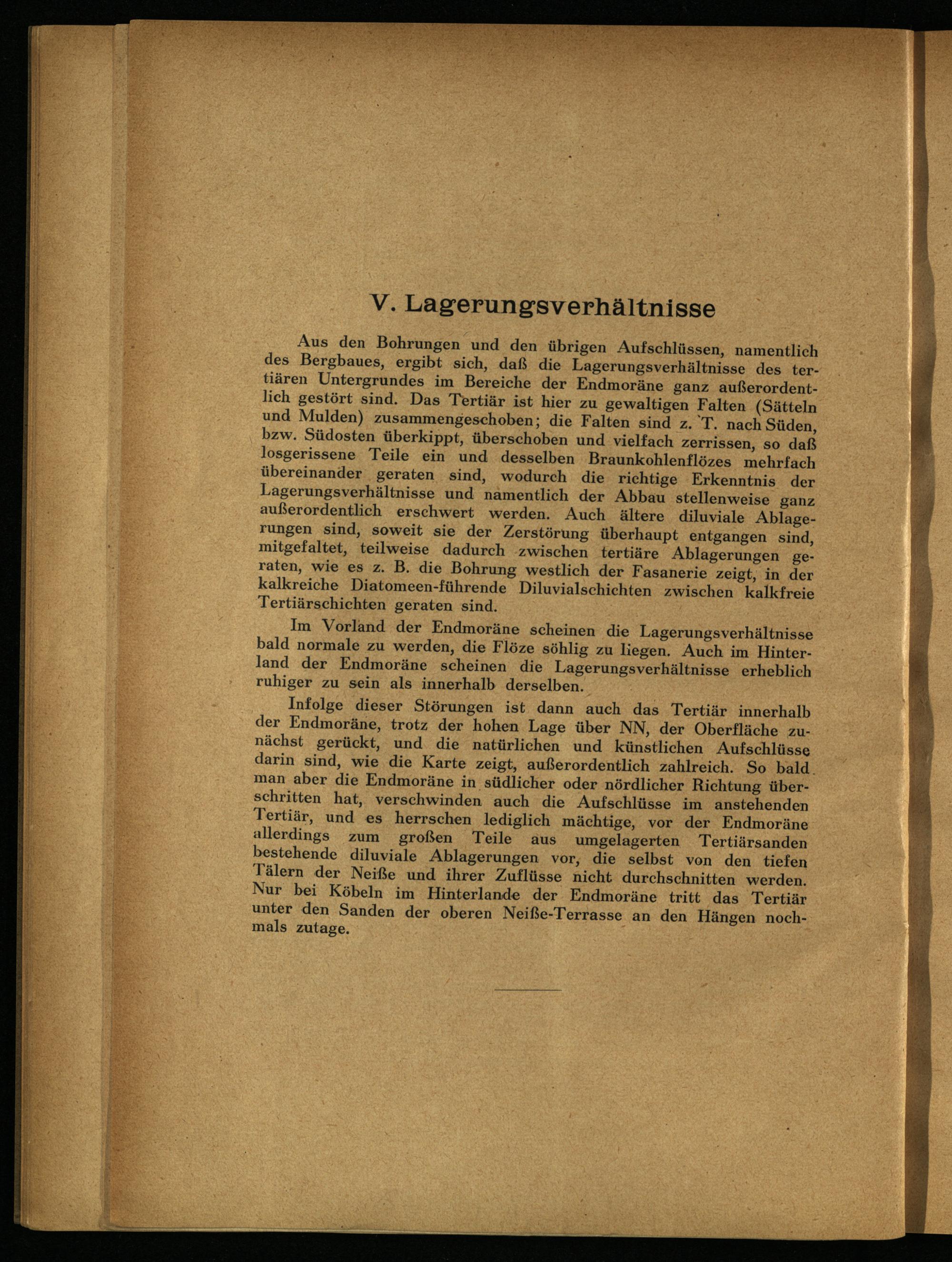 Aus den Bohrungen und den übrigen Aufschlüssen, namentlich des Bergbaues, ergibt sich, daß die Lagerungsverhältnisse des tertiären Untergrundes im Bereiche der Endmoräne ganz außerordentlich gestört sind. Das Tertiär ist hier zu gewaltigen Falten (Sätteln und Mulden) zusammengeschoben; die Falten sind z. T. nach Süden, bzw. Südosten überkippt, überschoben und vielfach zerrissen, so daß losgerissene Teile ein und desselben Braunkohlenflözes mehrfach übereinander geraten sind, wodurch die richtige Erkenntnis der Lagerungsverhältnisse und namentlich der Abbau stellenweise ganz außerordentlich erschwert werden. Auch ältere diluviale Ablagerungen sind, soweit sie der Zerstörung überhaupt entgangen sind, mitgefaltet, teilweise dadurch zwischen tertiäre Ablagerungen geraten, wie es z. B. die Bohrung westlich der Fasanerie zeigt, in der kalkreiche Diatomeen-führende Diluvialschichten zwischen kalkfreie Tertiärschichten geraten sind.