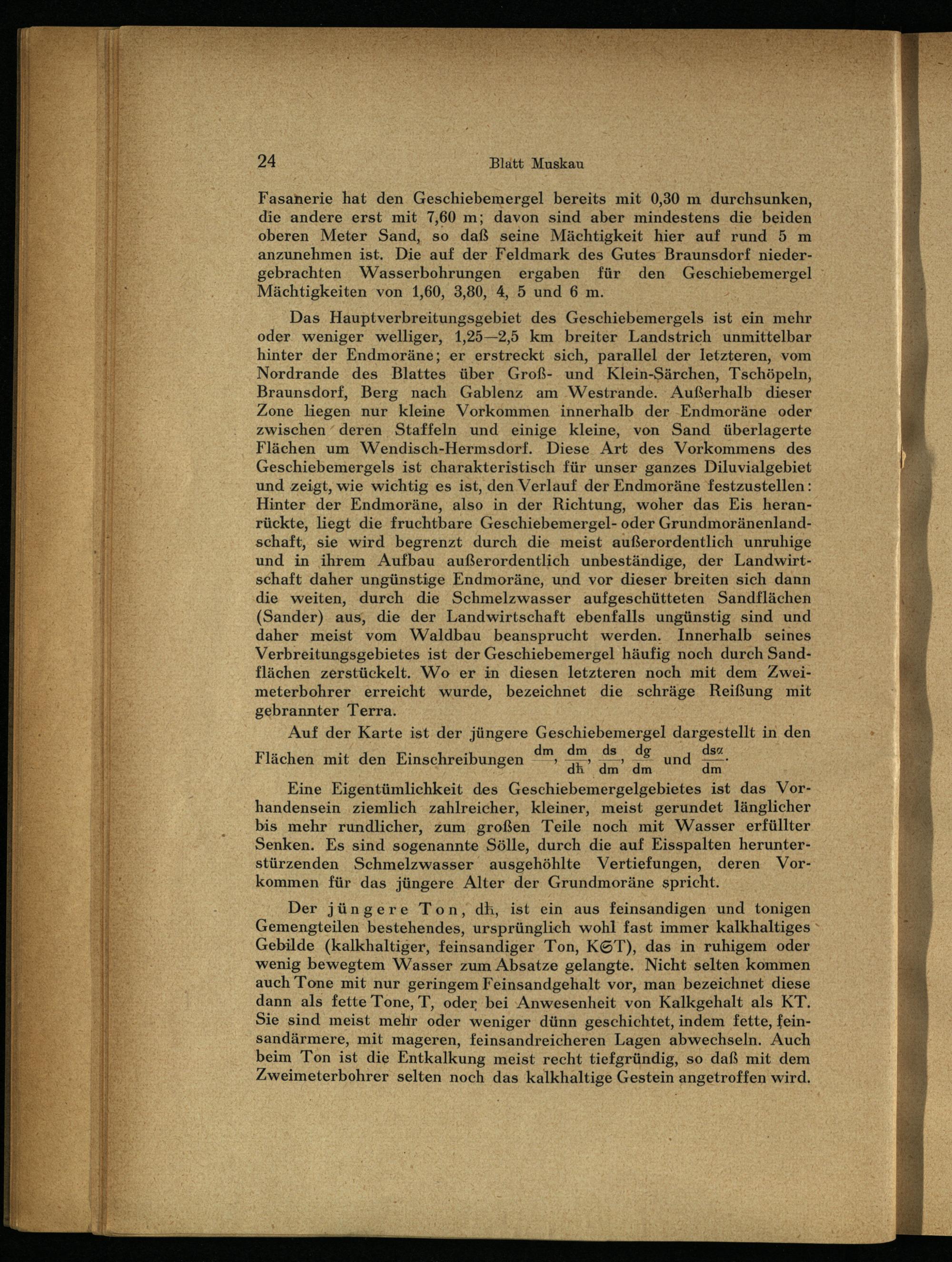 Das Hauptverbreitungsgebiet des Geschiebemergels ist ein mehr oder weniger welliger, 1,25—2,5 km breiter Landstrich unmittelbar hinter der Endmoräne; er erstreckt sich, parallel der letzteren, vom Nordrande des Blattes über Groß- und Klein-Särchen, Tschöpeln, Braunsdorf, Berg nach Gablenz am Westrande. Außerhalb dieser Zone liegen nur kleine Vorkommen innerhalb der Endmoräne oder zwischen deren Staffeln und einige kleine, von Sand überlagerte Flächen um Wendisch-Hermsdorf. Diese Art des Vorkommens des Geschiebemergels ist charakteristisch für unser ganzes Diluvialgebiet und zeigt, wie wichtig es ist, den Verlauf der Endmoräne festzustellen: Hinter der Endmoräne, also in der Richtung, woher das Eis heranrückte, liegt die fruchtbare Geschiebemergel- oder Grundmoränenlandschaft, sie wird begrenzt durch die meist außerordentlich unruhige und in ihrem Aufbau außerordentlich unbeständige, der Landwirtschaft daher ungünstige Endmoräne, und vor dieser breiten sich dann die weiten, durch die Schmelzwasser aufgeschütteten Sandflächen (Sander) aus, die der Landwirtschaft ebenfalls ungünstig sind und daher meist vom Waldbau beansprucht werden. Innerhalb seines Verbreitungsgebietes ist der Geschiebemergel häufig noch durch Sandflächen zerstückelt. Wo er in diesen letzteren noch mit dem Zweimeterbohrer erreicht wurde, bezeichnet die schräge Reißung mit gebrannter Terra.