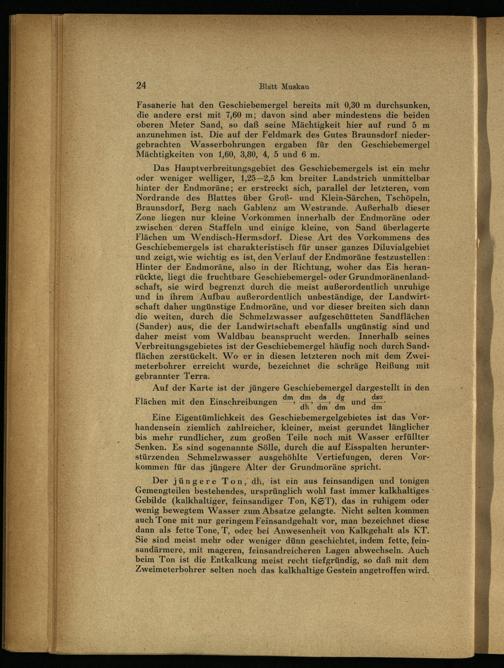 Fasanerie hat den Geschiebemergel bereits mit 0,30 m durchsunken, die andere erst mit 7,60 m; davon sind aber mindestens die beiden oberen Meter Sand, so daß seine Mächtigkeit hier auf rund 5 m anzunehmen ist. Die auf der Feldmark des Gutes Braunsdorf niedergebrachten Wasserbohrungen ergaben für den Geschiebemergel Mächtigkeiten von 1,60, 3,80, 4, 5 und 6 m.
