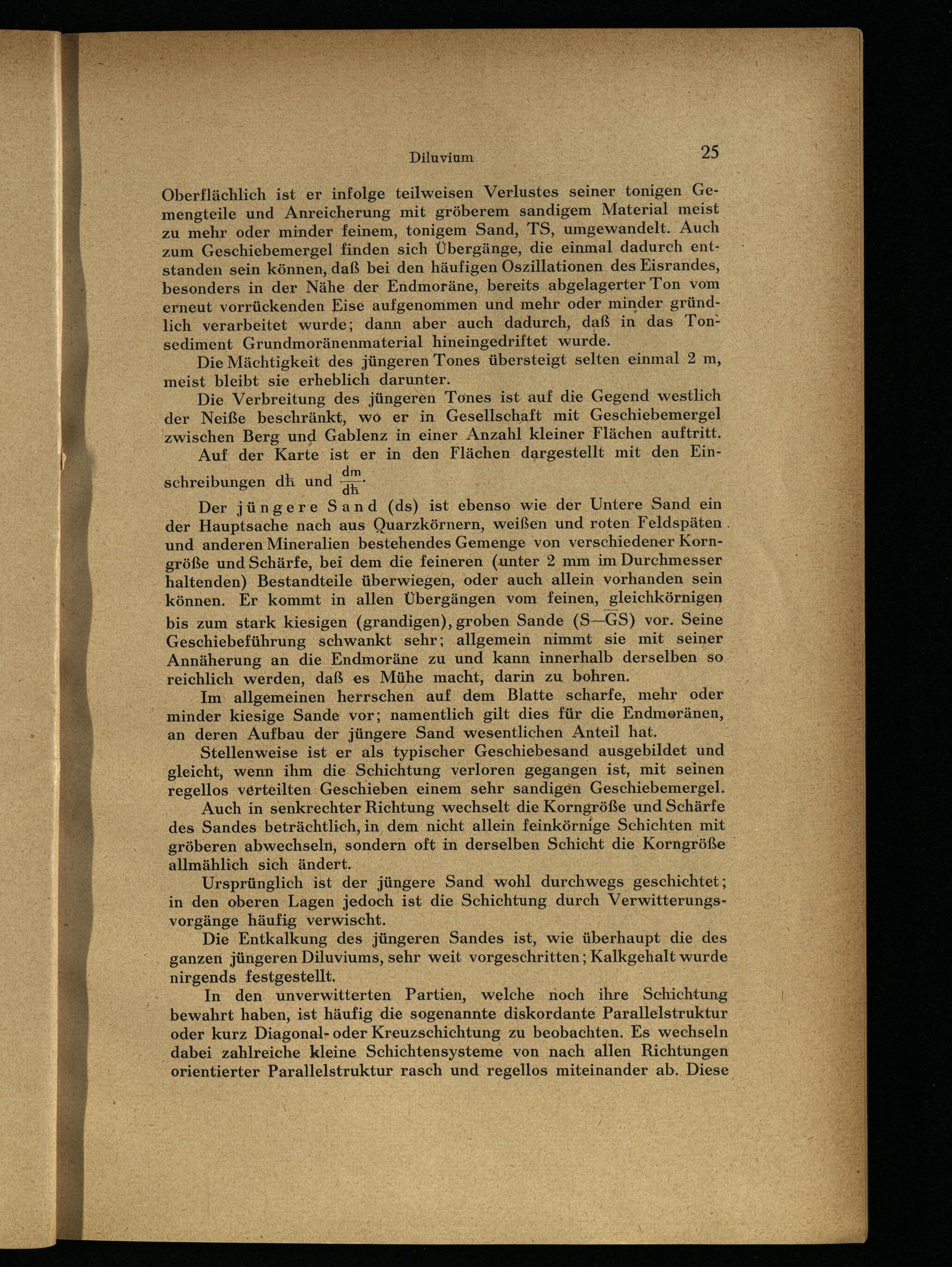 Der jüngere Sand (ds) ist ebenso wie der Untere Sand ein der Hauptsache nach aus Ouarzkörnern, weißen und roten Feldspäten und anderen Mineralien bestehendes Gemenge von verschiedener Korngröße und Schärfe, bei dem die feineren (unter 2 mm im Durchmesser haltenden) Bestandteile überwiegen, oder auch allein vorhanden sein können. Er kommt in allen Übergängen vom feinen, gleichkörnigen bis zum stark kiesigen (grandigen), groben Sande (S—GS) vor. Seine Geschiebeführung schwankt sehr; allgemein nimmt sie mit seiner Annäherung an die Endmoräne zu und kann innerhalb derselben so reichlich werden, daß es Mühe macht, darin zu bohren.