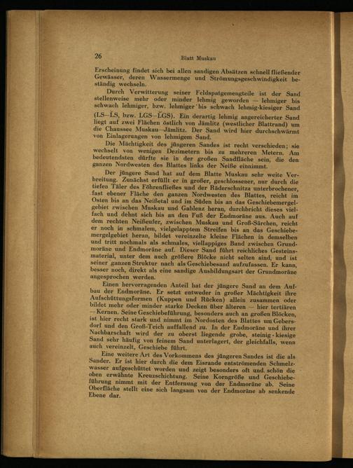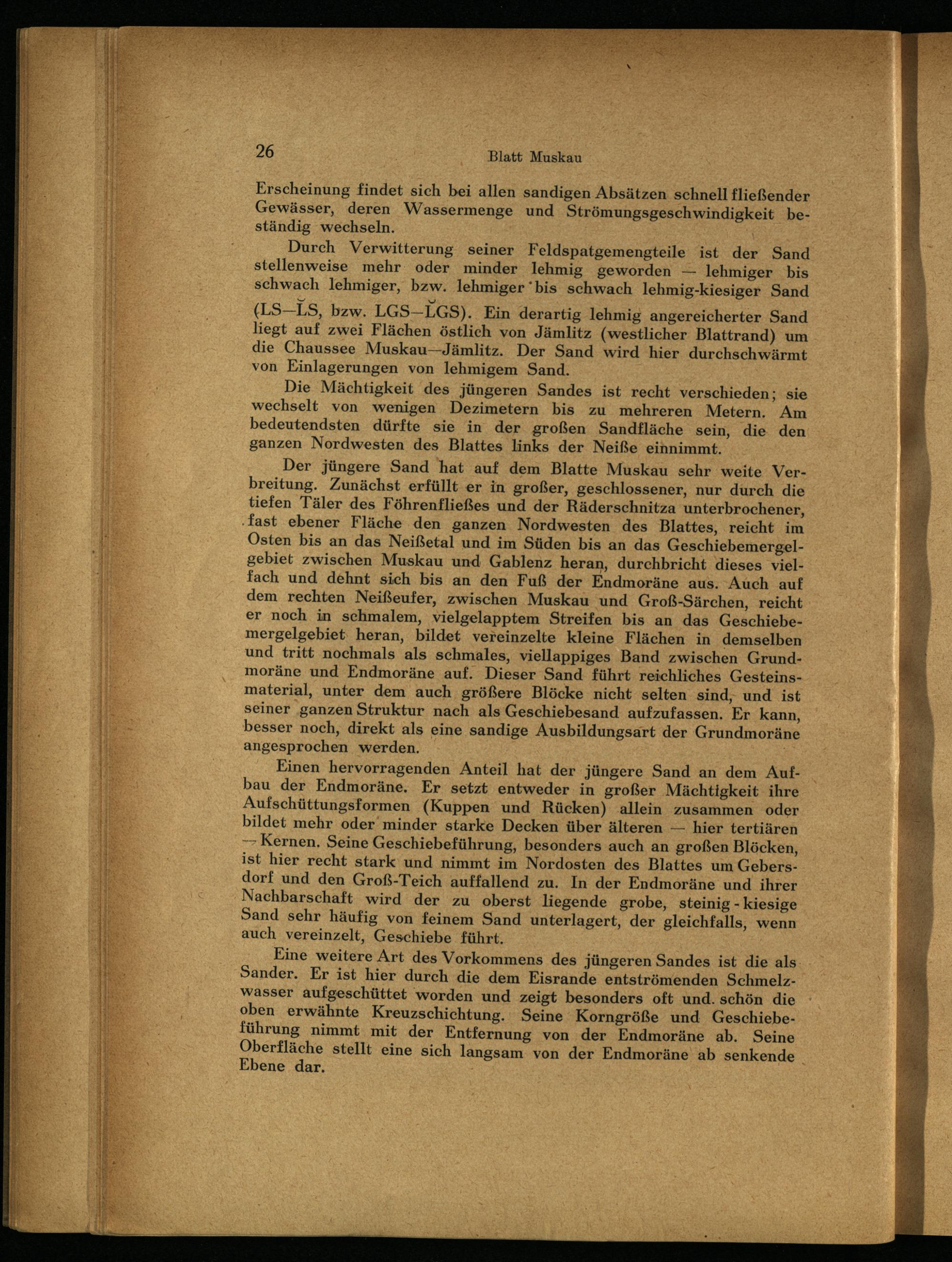 . fast ebener Fläche den ganzen Nordwesten des Blattes, reicht im Osten bis an das Neißetal und im Süden bis an das Geschiebemergel­gebiet zwischen Muskau und Gablenz heran, durchbricht dieses viel­fach und dehnt sich bis an den Fuß der Endmoräne aus. Auch auf dem rechten Neißeufer, zwischen Muskau und Groß-Särchen, reicht er noch in schmalem, vielgelapptem Streifen bis an das Geschiebe­mergelgebiet heran, bildet vereinzelte kleine Flächen in demselben und tritt nochmals als schmales, viellappiges Band zwischen Grund­moräne und Endmoräne auf. Dieser Sand führt reichliches Gesteins­material, unter dem auch größere Blöcke nicht selten sind, und ist seiner ganzen Struktur nach als Geschiebesand aufzufassen. Er kann, besser noch, direkt als eine sandige Ausbildungsart der Grundmoräne angesprochen werden.