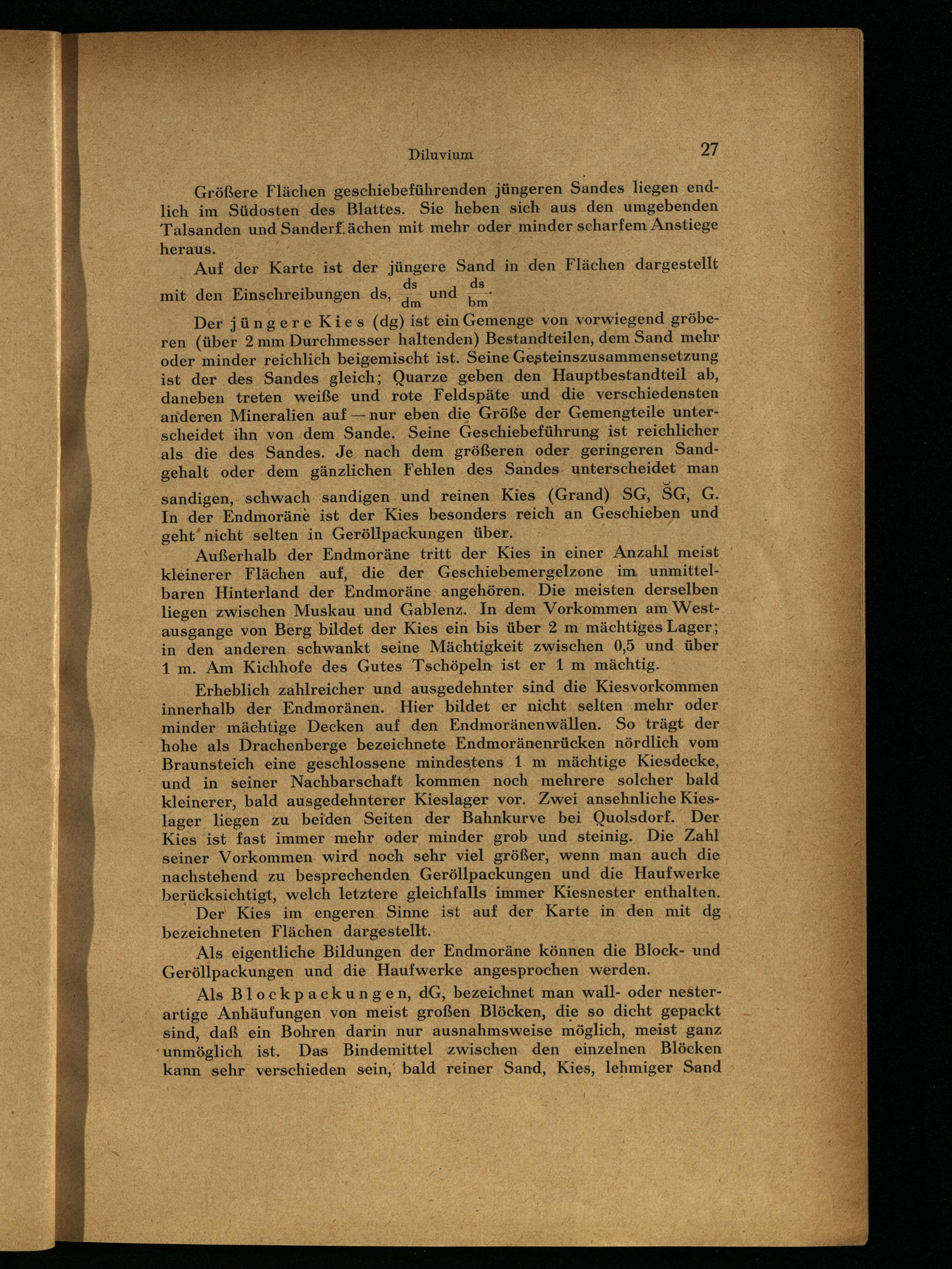 sandigen, schwach sandigen und reinen Kies (Grand) SG, SG, G. In der Endmoräne ist der Kies besonders reich an Geschieben und geht nicht selten in Geröllpackungen über.