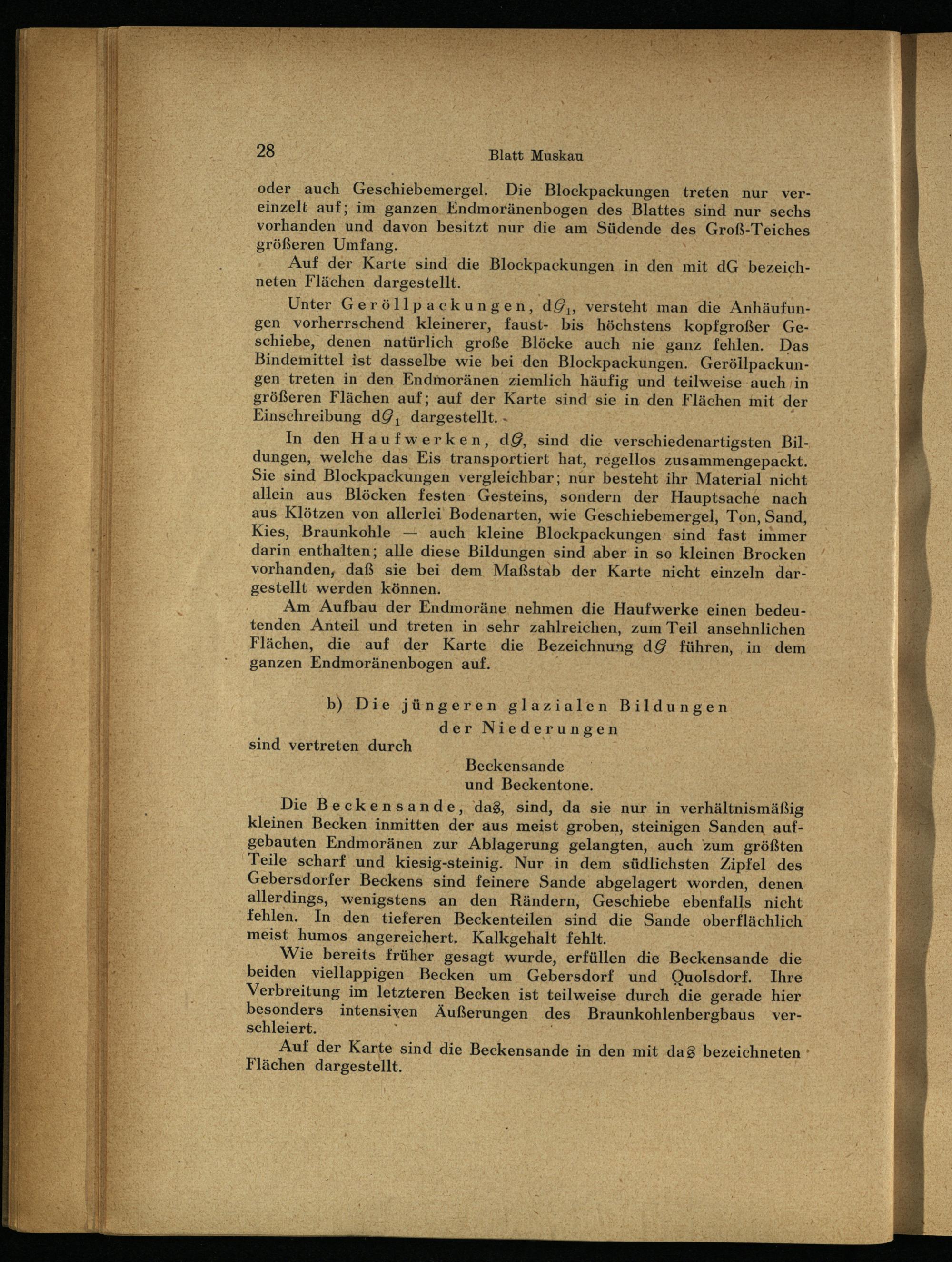 Die Beckensande, dag, sind, da sie nur in verhältnismäßig kleinen Becken inmitten der aus meist groben, steinigen Sanden auf­gebauten Endmoränen zur Ablagerung gelangten, auch zum größten Teile scharf und kiesig-steinig. Nur in dem südlichsten Zipfel des Gebersdörfer Beckens sind feinere Sande abgelagert worden, denen allerdings, wenigstens an den Rändern, Geschiebe ebenfalls nicht fehlen. In den tieferen Beckenteilen sind die Sande oberflächlich meist humos angereichert. Kalkgehalt fehlt.