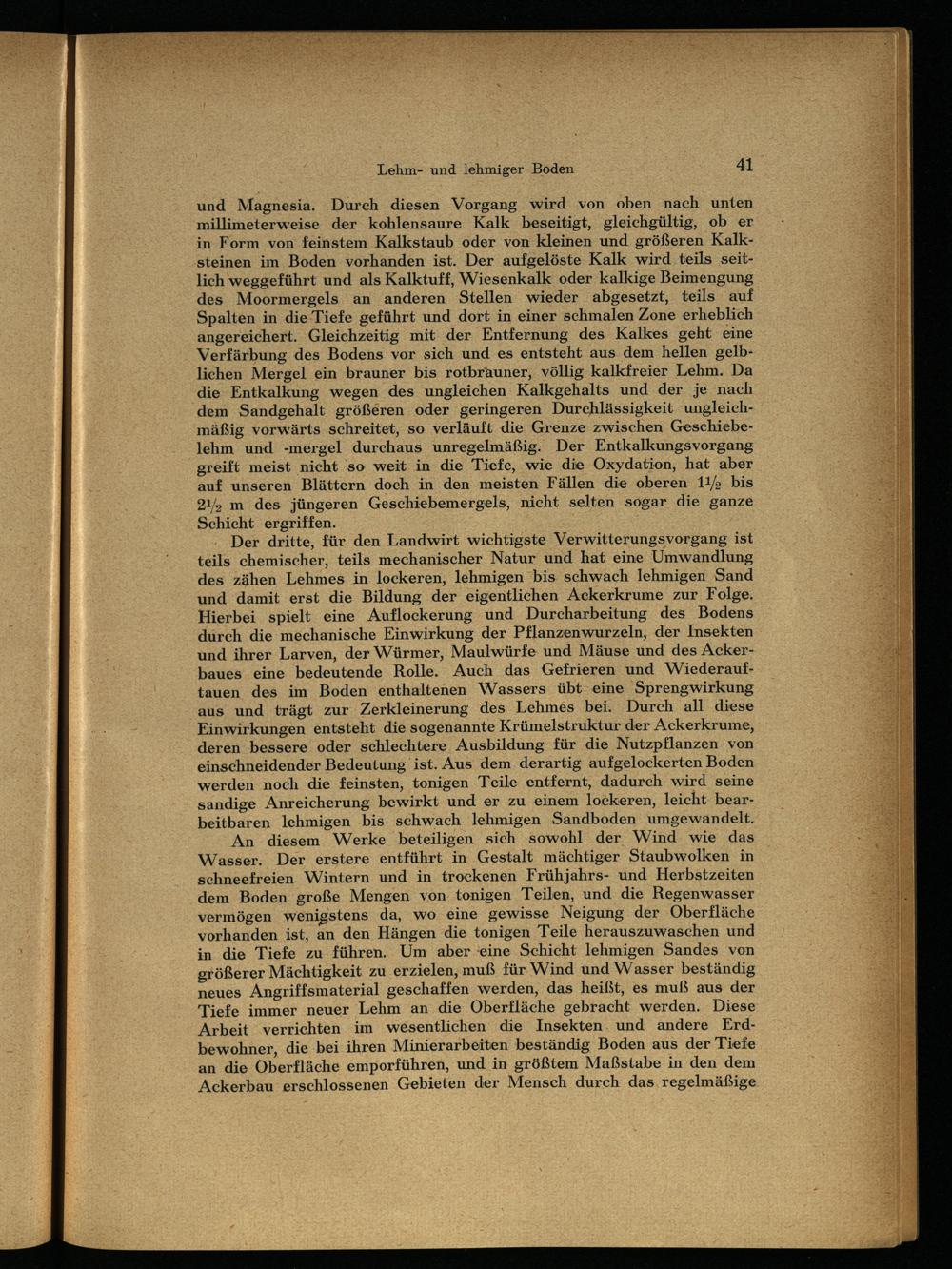 An diesem Werke beteiligen sich sowohl der Wind wie das Wasser. Der erstere entführt in Gestalt mächtiger Staubwolken in schneefreien Wintern und in trockenen Frühjahrs- und Herbstzeiten dem Boden große Mengen von tonigen Teilen, und die Regenwasser vermögen wenigstens da, wo eine gewisse Neigung der Oberfläche vorhanden ist, an den Hängen die tonigen Teile herauszuwaschen und in die Tiefe zu führen. Um aber eine Schicht lehmigen Sandes von größerer Mächtigkeit zu erzielen, muß für Wind und Wasser beständig neues Angriffsmaterial geschaffen werden, das heißt, es muß aus der Tiefe immer neuer Lehm an die Oberfläche gebracht werden. Diese Arbeit verrichten im wesentlichen die Insekten und andere Erdbewohner, die bei ihren Minierarbeiten beständig Boden aus der Tiefe an die Oberfläche emporführen, und in größtem Maßstabe in den dem Ackerbau erschlossenen Gebieten der Mensch durch das regelmäßige