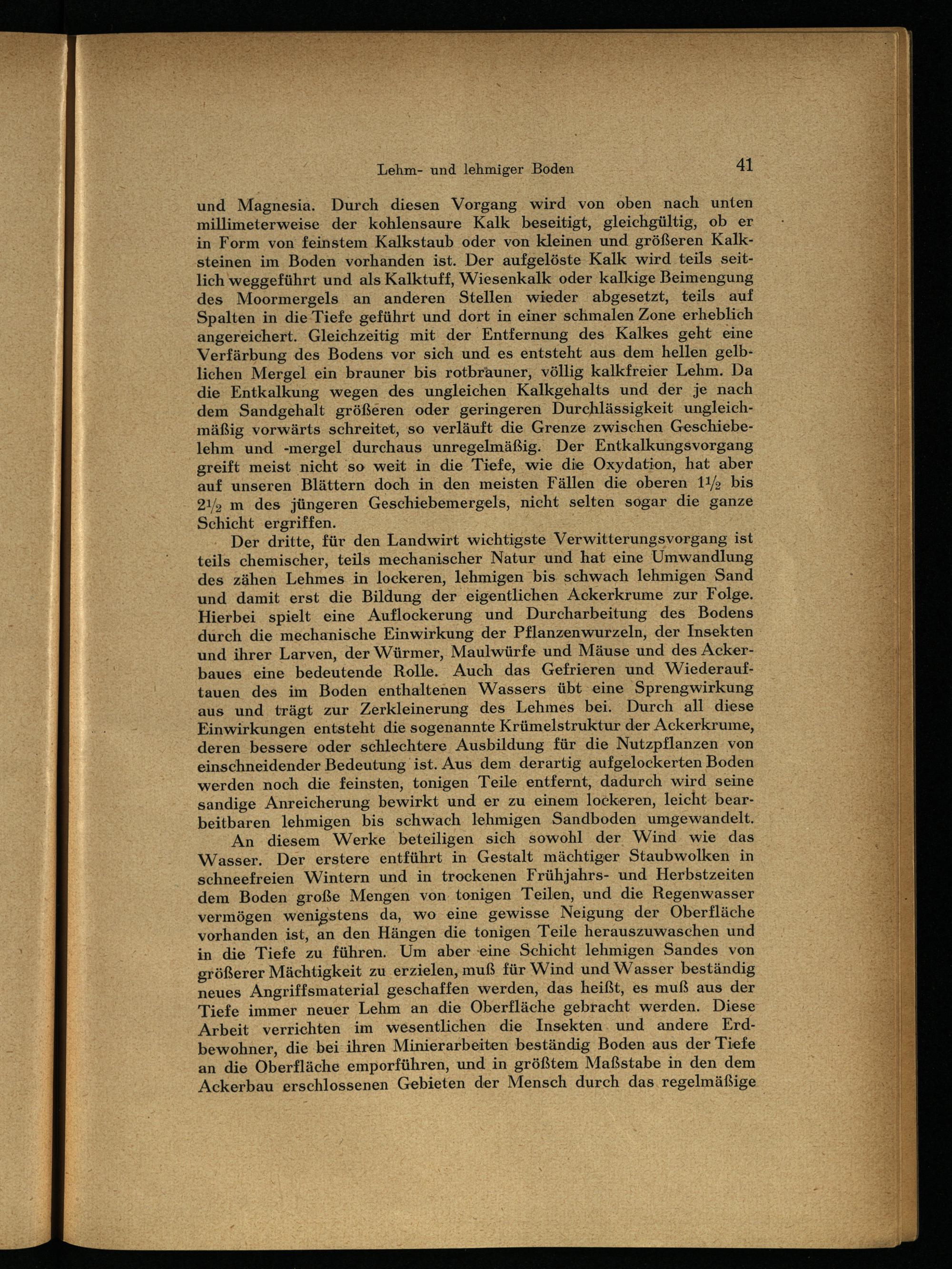 Der dritte, für den Landwirt wichtigste Verwitterungsvorgang ist teils chemischer, teils mechanischer Natur und hat eine Umwandlung des zähen Lehmes in lockeren, lehmigen bis schwach lehmigen Sand und damit erst die Bildung der eigentlichen Ackerkrume zur Folge. Hierbei spielt eine Auflockerung und Durcharbeitung des Bodens durch die mechanische Einwirkung der Pflanzenwurzeln, der Insekten und ihrer Larven, der Würmer, Maulwürfe und Mäuse und des Ackerbaues eine bedeutende Rolle. Auch das Gefrieren und Wiederauftauen des im Boden enthaltenen Wassers übt eine Sprengwirkung aus und trägt zur Zerkleinerung des Lehmes bei. Durch all diese Einwirkungen entsteht die sogenannte Krümelstruktur der Ackerkrume, deren bessere oder schlechtere Ausbildung für die Nutzpflanzen von einschneidender Bedeutung ist. Aus dem derartig aufgelockerten Boden werden noch die feinsten, tonigen Teile entfernt, dadurch wird seine sandige Anreicherung bewirkt und er zu einem lockeren, leicht bearbeitbaren lehmigen bis schwach lehmigen Sandboden umgewandelt.