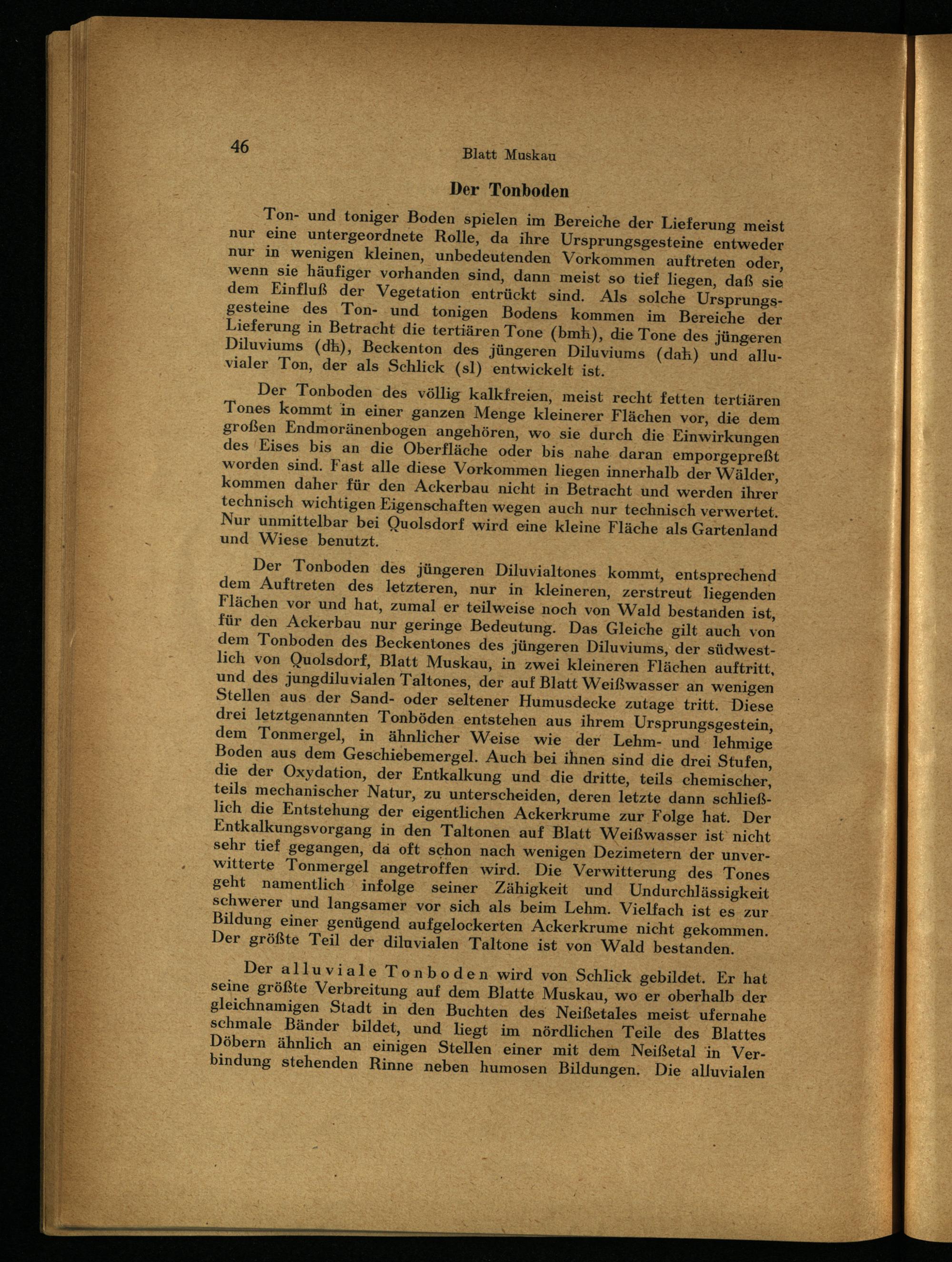 Der Tonboden des jüngeren Diluvialtones kommt, entsprechend dem Auftreten des letzteren, nur in kleineren, zerstreut liegenden Flächen vor und hat, zumal er teilweise noch von Wald bestanden ist, für den Ackerbau nur geringe Bedeutung. Das Gleiche gilt auch von dem Tonboden des Beckentones des jüngeren Diluviums, der südwest­lich von Quolsdorf , Blatt Muskau , in zwei kleineren Flächen auftritt, und des jungdiluvialen Taltones, der auf Blatt Weißwasser an wenigen Stellen aus der Sand- oder seltener Humusdecke zutage tritt. Diese drei letztgenannten Tonböden entstehen aus ihrem Ursprungsgestein, dem Tonmergel, in ähnlicher Weise wie der Lehm- und lehmige Boden aus dem Geschiebemergel. Auch bei ihnen sind die drei Stufen, die der Oxydation, der Entkalkung und die dritte, teils chemischer, teils mechanischer Natur, zu unterscheiden, deren letzte dann schließ­lich die Entstehung der eigentlichen Ackerkrume zur Folge hat. Der Entkalkungsvorgang in den Taltonen auf Blatt Weißwasser ist nicht sehr tief gegangen, da oft schon nach wenigen Dezimetern der unver­witterte Tonmergel angetroffen wird. Die Verwitterung des Tones geht namentlich infolge seiner Zähigkeit und Undurchlässigkeit schwerer und langsamer vor sich als beim Lehm. Vielfach ist es zur Bildung einer genügend aufgelockerten Ackerkrume nicht gekommen. Der größte Teil der diluvialen Taltone ist von Wald bestanden.