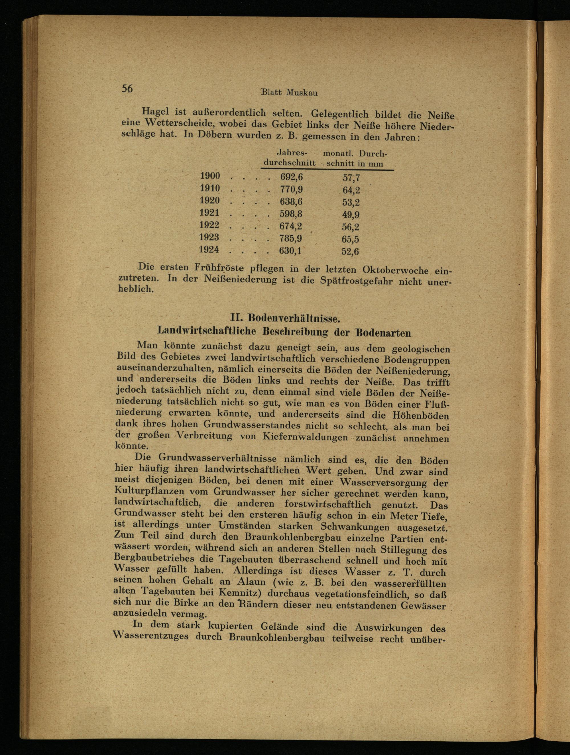 Man könnte zunächst dazu geneigt sein, aus dem geologischen Bild des Gebietes zwei landwirtschaftlich verschiedene Bodengruppen auseinanderzuhalten, nämlich einerseits die Böden der Neißeniederung, und andererseits die Böden links und rechts der Neiße . Das trifft jedoch tatsächlich nicht zu, denn einmal sind viele Böden der Neißeniederung tatsächlich nicht so gut, wie man es von Böden einer Flußniederung erwarten könnte, und andererseits sind die Höhenböden dank ihres hohen Grundwasserstandes nicht so schlecht, als man bei der großen Verbreitung von Kiefernwaldungen zunächst annehmen könnte.