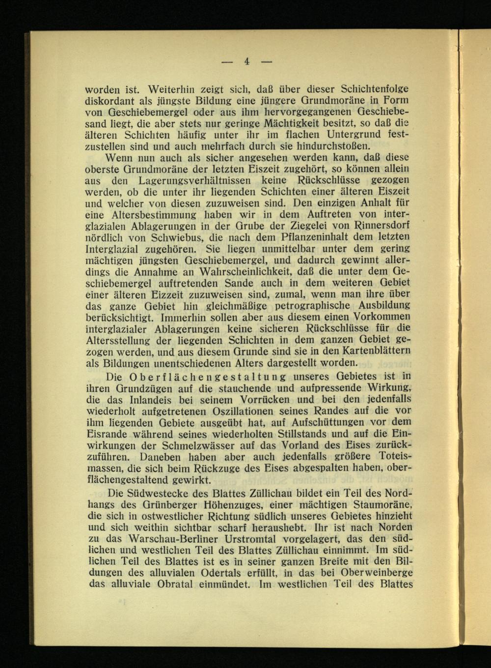 Wenn nun auch als sicher angesehen werden kann, daß diese oberste Grundmoräne der letzten Eiszeit zugehört, so können allein aus den Lagerungsverhältnissen keine Rückschlüsse gezogen werden, ob die unter ihr liegenden Schichten einer älteren Eiszeit und welcher von diesen zuzuweisen sind. Den einzigen Anhalt für eine Altersbestimmung haben wir in dem Auftreten von inter- glazialen Ablagerungen in der Grube der Ziegelei von Rinnersdorf nördlich von Schwiebus , die nach dem Pflanzeninhalt dem letzten Interglazial zugehören. Sie liegen unmittelbar unter dem gering mächtigen jüngsten Geschiebemergel, und dadurch gewinnt allerdings die Annahme an Wahrscheinlichkeit, daß die unter dem Geschiebemergel auftretenden Sande auch in dem weiteren Gebiet einer älteren Eizzeit zuzuweisen sind, zumal, wenn man ihre über das ganze Gebiet hin gleichmäßige petrographische Ausbildung berücksichtigt. Immerhin sollen aber aus diesem einen Vorkommen interglazialer Ablagerungen keine sicheren Rückschlüsse für die Altersstellung der liegenden Schichten in dem ganzen Gebiet gezogen werden, und aus diesem Grunde sind sie in den Kartenblättern als Bildungen unentschiedenen Alters dargestellt worden.