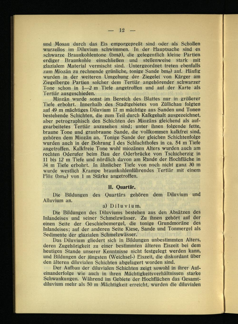Miozän wurde sonst im Bereich des Blattes nur in größerer Tiefe erbohrt. Innerhalb des Stadtgebietes von Züllichau folgten auf 49 m mächtiges Diluvium 17 m mächtige aus Sanden und Tonen bestehende Schichten, die zum Teil durch Kalkgehalt ausgezeichnet, aber petrographisch den Schichten des Miozäns gleichend als aufgearbeitetes Tertiär anzusehen sind; unter ihnen folgende fette, braune Tone und graubraune Sande, die vollkommen kalkfrei sind, gehören dem Miozän an. Tonige Sande der gleichen Schichtenfolge wurden auch in der Bohrung I des Schlachthofes in ca. 54 m Tiefe angetroffen. Kalkfreie Tone wohl miozänen Alters wurden auch am rechten Oderufer beim Bau der Oderbrücke von Tschicherzig in 11 bis 12 m Tiefe und nördlich davon am Rande der Hochfläche in .34 m Tiefe erbohrt. In ähnlicher Tiefe von noch nicht ganz 30 m wurde westlich Krampe braunkohlenführendes Tertiär mit einem Flöz (bm*) von 1 m Stärke angetroffen.