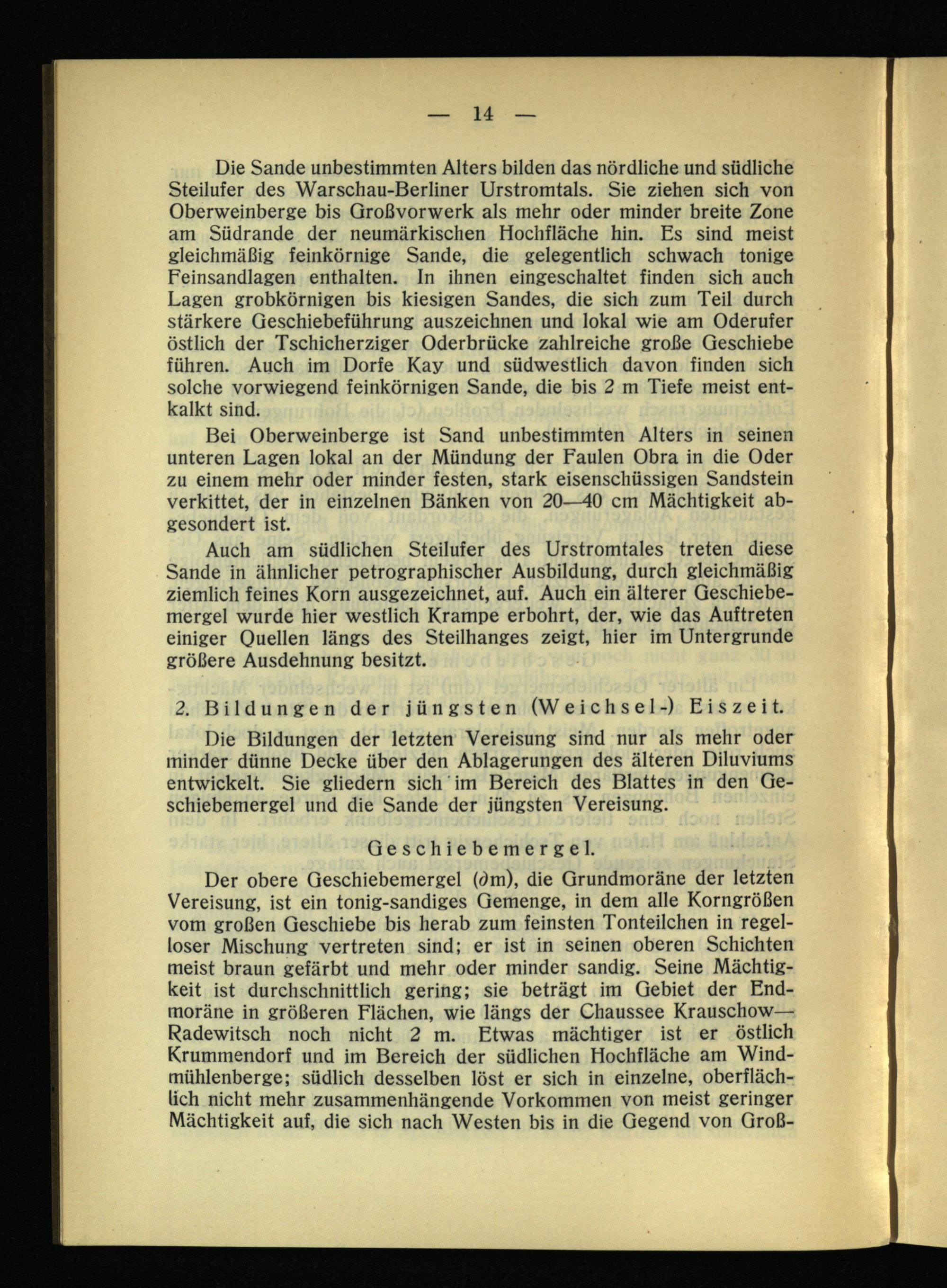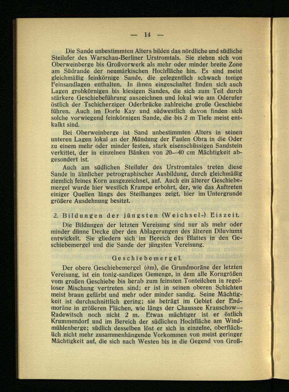 Die Sande unbestimmten Alters bilden das nördliche und südliche Steilufer des Warschau -Berliner Urstromtals. Sie ziehen sich von Oberweinberge bis Großvorwerk als mehr oder minder breite Zone am Südrande der neumärkischen Hochfläche hin. Es sind meist gleichmäßig feinkörnige Sande, die gelegentlich schwach tonige Feinsandlagen enthalten, ln ihnen eingeschaltet finden sich auch Lagen grobkörnigen bis kiesigen Sandes, die sich zum Teil durch stärkere Geschiebeführung auszeichnen und lokal wie am Oderufer östlich der Tschicherziger Oderbrücke zahlreiche große Geschiebe führen. Auch im Dorfe Kay und südwestlich davon finden sich solche vorwiegend feinkörnigen Sande, die bis 2 m Tiefe meist entkalkt sind.