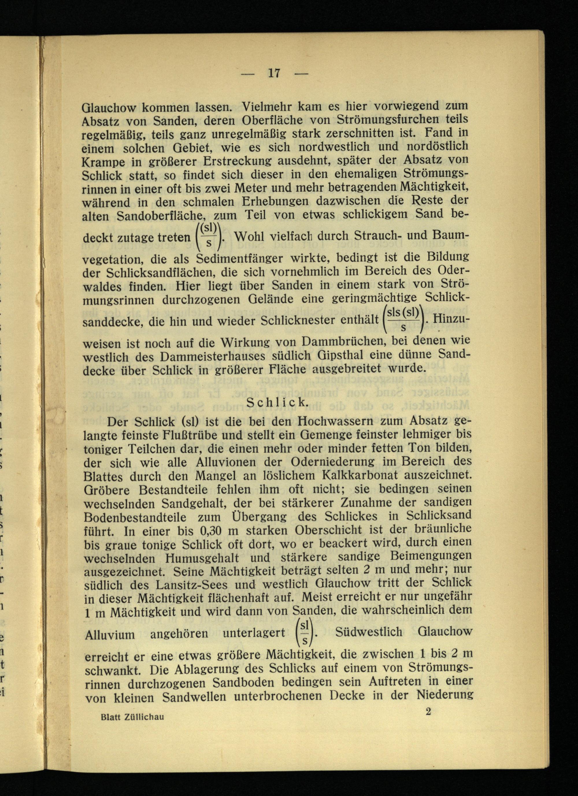 Der Schlick (sl) ist die bei den Hochwassern zum Absatz gelangte feinste Flußtrübe und stellt ein Gemenge feinster lehmiger bis toniger Teilchen dar, die einen mehr oder minder fetten Ton bilden, der sich wie alle Alluvionen der Oderniederung im Bereich des Blattes durch den Mangel an löslichem Kalkkarbonat auszeichnet. Gröbere Bestandteile fehlen ihm oft nicht; sie bedingen seinen wechselnden Sandgehalt, der bei stärkerer Zunahme der sandigen Bodenbestandteile zum Übergang des Schlickes in Schlicksand führt. In einer bis 0,30 m starken Oberschicht ist der bräunliche bis graue tonige Schlick oft dort, wo er beackert wird, durch einen wechselnden Humusgehalt und stärkere sandige Beimengungen ausgezeichnet. Seine Mächtigkeit beträgt selten 2 m und mehr; nur südlich des Lansitz-Sees und westlich Glauchow tritt der Schlick in dieser Mächtigkeit flächenhaft auf. Meist erreicht er nur ungefähr 1 m Mächtigkeit und wird dann von Sanden , die wahrscheinlich dem
