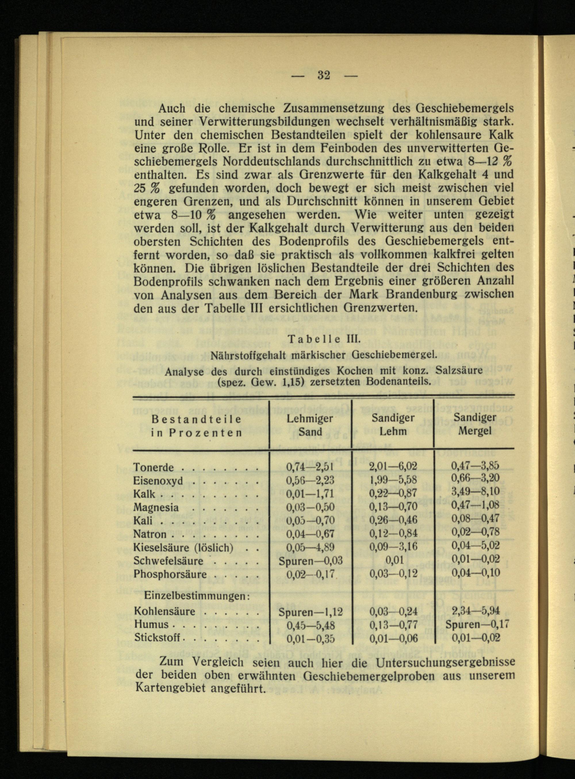 Auch die chemische Zusammensetzung des Geschiebemergels und seiner Verwitterungsbildungen wechselt verhältnismäßig stark. Unter den chemischen Bestandteilen spielt der kohlensaure Kalk eine große Rolle. Er ist in dem Feinboden des unverwitterten Geschiebemergels Norddeutschlands durchschnittlich zu etwa 8—12 % enthalten. Es sind zwar als Grenzwerte für den Kalkgehalt 4 und 25 % gefunden worden, doch bewegt er sich meist zwischen viel engeren Grenzen, und als Durchschnitt können in unserem Gebiet etwa 8—10 % angesehen werden. Wie weiter unten gezeigt werden soll, ist der Kalkgehalt durch Verwitterung aus den beiden obersten Schichten des Bodenprofils des Geschiebemergels entfernt worden, so daß sie praktisch als vollkommen kalkfrei gelten können. Die übrigen löslichen Bestandteile der drei Schichten des Bodenprofils schwanken nach dem Ergebnis einer größeren Anzahl von Analysen aus dem Bereich der Mark Brandenburg zwischen den aus der Tabelle III ersichtlichen Grenzwerten.