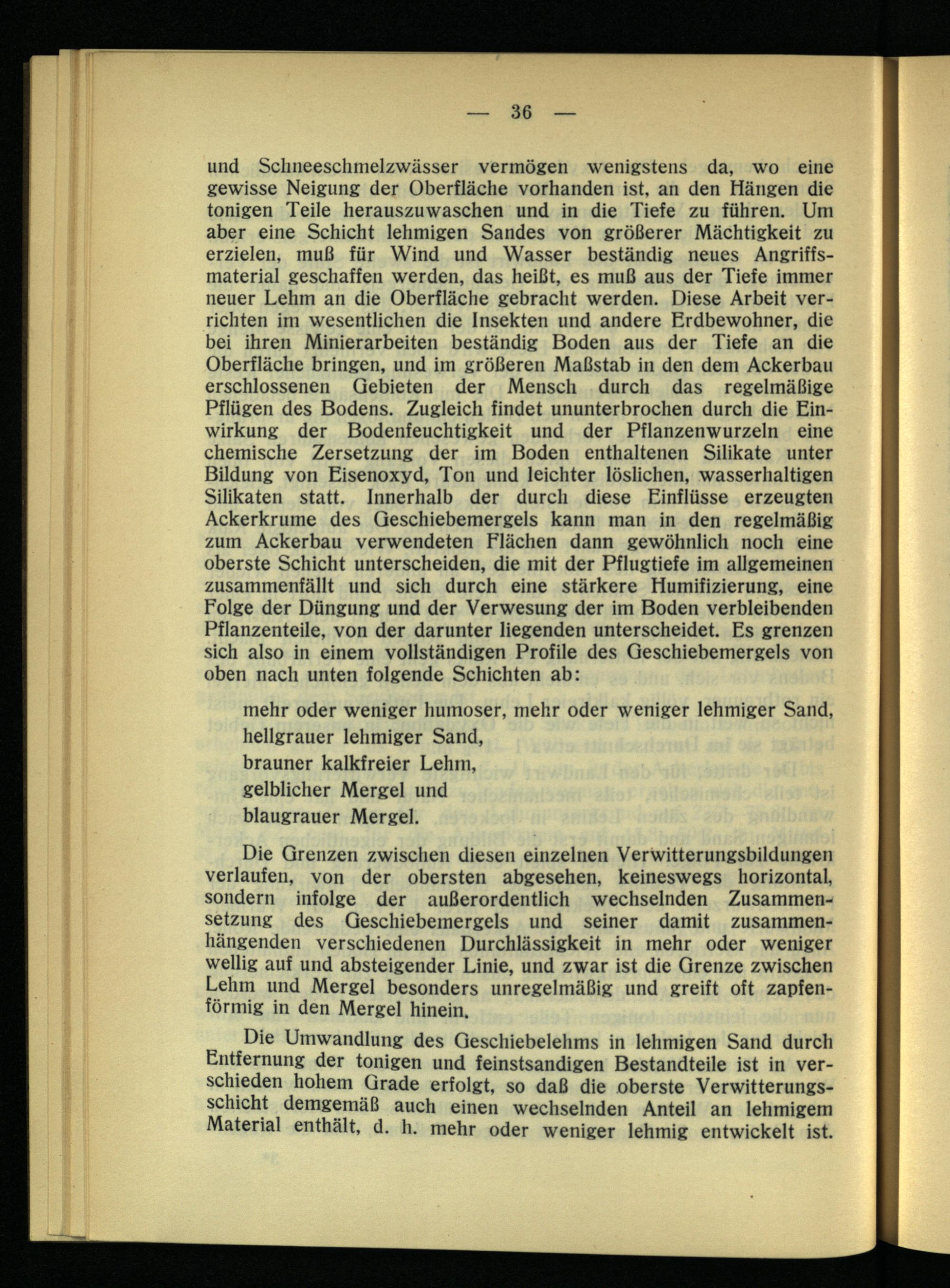 und Schneeschmelzwässer vermögen wenigstens da, wo eine gewisse Neigung der Oberfläche vorhanden ist, an den Hängen die tonigen Teile herauszuwaschen und in die Tiefe zu führen. Um aber eine Schicht lehmigen Sandes von größerer Mächtigkeit zu erzielen, muß für Wind und Wasser beständig neues Angriffsmaterial geschaffen werden, das heißt, es muß aus der Tiefe immer neuer Lehm an die Oberfläche gebracht werden. Diese Arbeit verrichten im wesentlichen die Insekten und andere Erdbewohner, die bei ihren Minierarbeiten beständig Boden aus der Tiefe an die Oberfläche bringen, und im größeren Maßstab in den dem Ackerbau erschlossenen Gebieten der Mensch durch das regelmäßige Pflügen des Bodens. Zugleich findet ununterbrochen durch die Einwirkung der Bodenfeuchtigkeit und der Pflanzenwurzeln eine chemische Zersetzung der im Boden enthaltenen Silikate unter Bildung von Eisenoxyd, Ton und leichter löslichen, wasserhaltigen Silikaten statt. Innerhalb der durch diese Einflüsse erzeugten Ackerkrume des Geschiebemergels kann man in den regelmäßig zum Ackerbau verwendeten Flächen dann gewöhnlich noch eine oberste Schicht unterscheiden, die mit der Pflugtiefe im allgemeinen zusammenfällt und sich durch eine stärkere Humifizierung, eine Folge der Düngung und der Verwesung der im Boden verbleibenden Pflanzenteile, von der darunter liegenden unterscheidet. Es grenzen sich also in einem vollständigen Profile des Geschiebemergels von oben nach unten folgende Schichten ab: