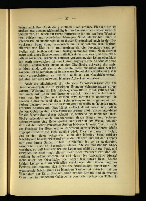 Wenn auch ihre Ausbildung vielfach über größere Flächen hin im großen und ganzen gleichmäßig ist, so kommen doch aber auch oft Stellen vor, an denen auf kurze Entfernung hin ein häufiger Wechsel von stärker und schwächer lehmigem Sand stattfindet. Und in solchen Fällen macht sich dann dieser Unterschied auch in der Bewachsung bemerkbar, namentlich bei anspruchsvolleren Kulturpflanzen wie Klee u. a. m., insofern als die besonders sandigen Stellen kahl bleiben oder nur dürftig bestanden sind. Noch stärker prägt sich diese Erscheinung natürlich dann aus, wenn, wie es ebenfalls in manchen Gegenden häufiger vorkommt, der Lehm oberflächlich stark verwaschen ist und kleine, engbegrenzte Sandnester von wenigen Zentimetern Dicke an der Oberfläche aufweist, die meist so klein sind, daß sie in der Karte nicht ausgeschieden werden können. Im allgemeinen ist in unserem Gebiet die Verwitterung sehr weit vorgeschritten, so daß wir auch in den Geschiebemergelgebieten nur eine schwach lehmige Ackerkrume haben.