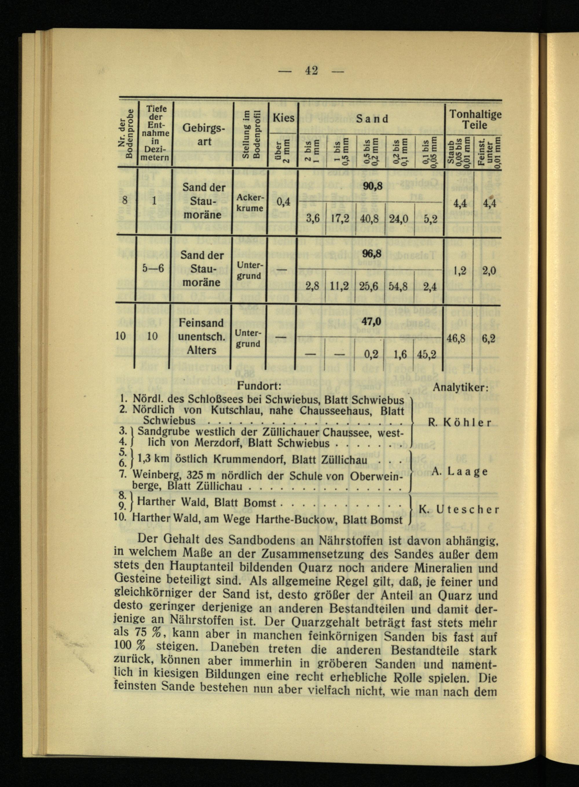 Der Gehalt des Sandbodens an Nährstoffen ist davon abhängig, in welchem Maße an der Zusammensetzung des Sandes außer dem stets den Hauptanteil bildenden Quarz noch andere Mineralien und Gesteine beteiligt sind. Als allgemeine Regel gilt, daß, je feiner und gleichkörniger der Sand ist, desto größer der Anteil an Quarz und desto geringer derjenige an anderen Bestandteilen und damit derjenige an Nährstoffen ist. Der Quarzgehalt beträgt fast stets mehr als 75 %, kann aber in manchen feinkörnigen Sanden bis fast auf 100 % steigen. Daneben treten die anderen Bestandteile stark zurück, können aber immerhin in gröberen Sanden und namentlich in kiesigen Bildungen eine recht erhebliche Rolle spielen. Die feinsten Sande bestehen nun aber vielfach nicht, wie man nach dem