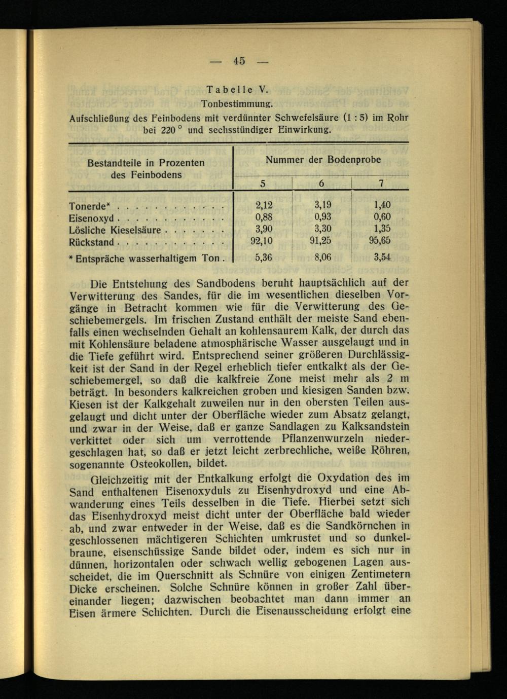 Die Entstehung des Sandbodens beruht hauptsächlich auf der Verwitterung des Sandes, für die im wesentlichen dieselben Vorgänge in Betracht kommen wie für die Verwitterung des Geschiebemergels. Im frischen Zustand enthält der meiste Sand ebenfalls einen wechselnden Gehalt an kohlensaurem Kalk, der durch das mit Kohlensäure beladene atmosphärische Wasser ausgelaugt und in die Tiefe geführt wird. Entsprechend seiner größeren Durchlässigkeit ist der Sand in der Regel erheblich tiefer entkalkt als der Geschiebemergel, so daß die kalkfreie Zone meist mehr als 2 m beträgt, ln besonders kalkreichen groben und kiesigen Sanden bzw. Kiesen ist der Kalkgehalt zuweilen nur in den obersten Teilen ausgelaugt und dicht unter der Oberfläche wieder zum Absatz gelangt, und zwar in der Weise, daß er ganze Sandlagen zu Kalksandstein verkittet oder sich um verrottende Pflanzenwurzeln niedergeschlagen hat, so daß er jetzt leicht zerbrechliche, weiße Röhren, sogenannte Osteokollen, bildet.