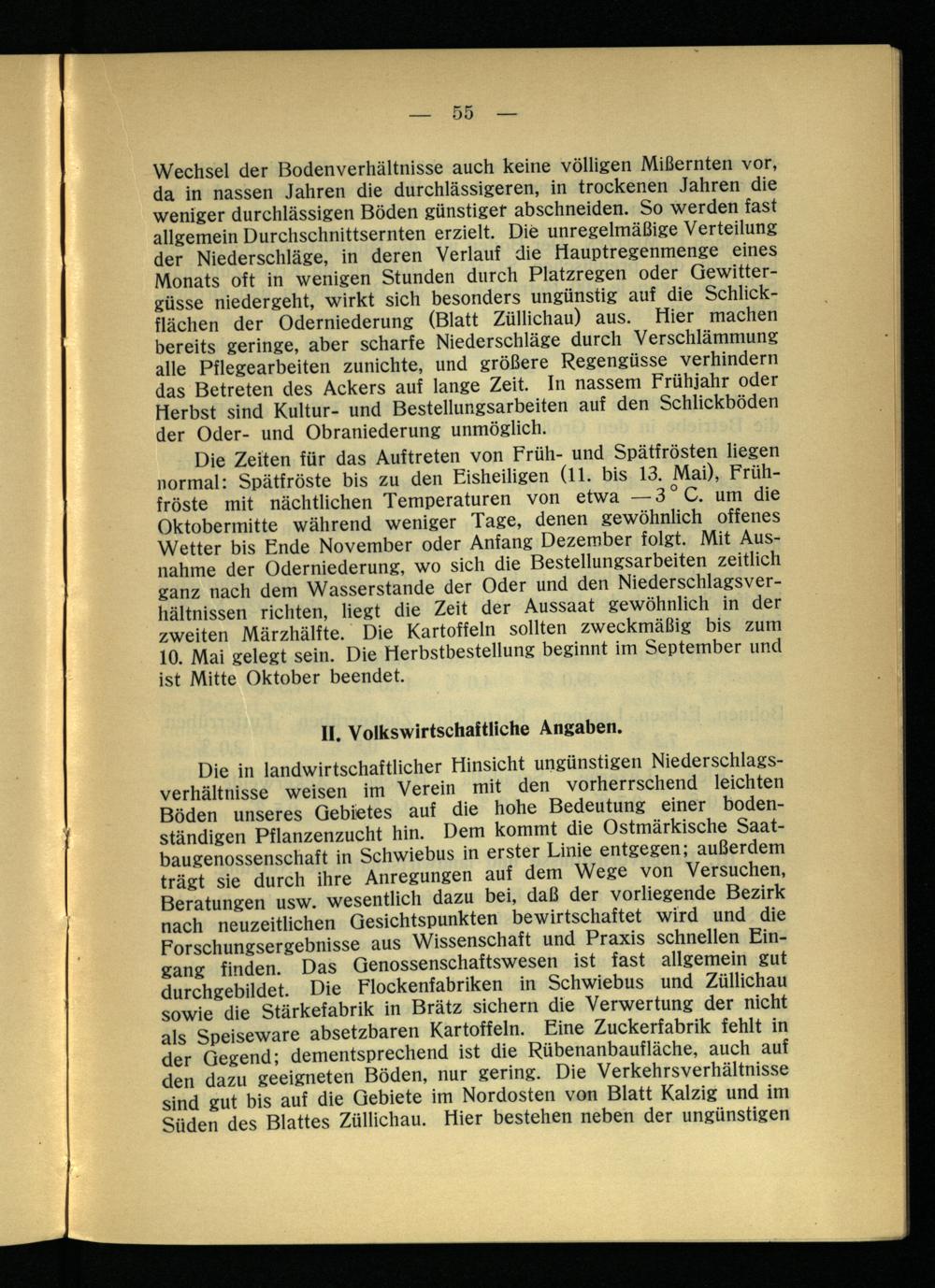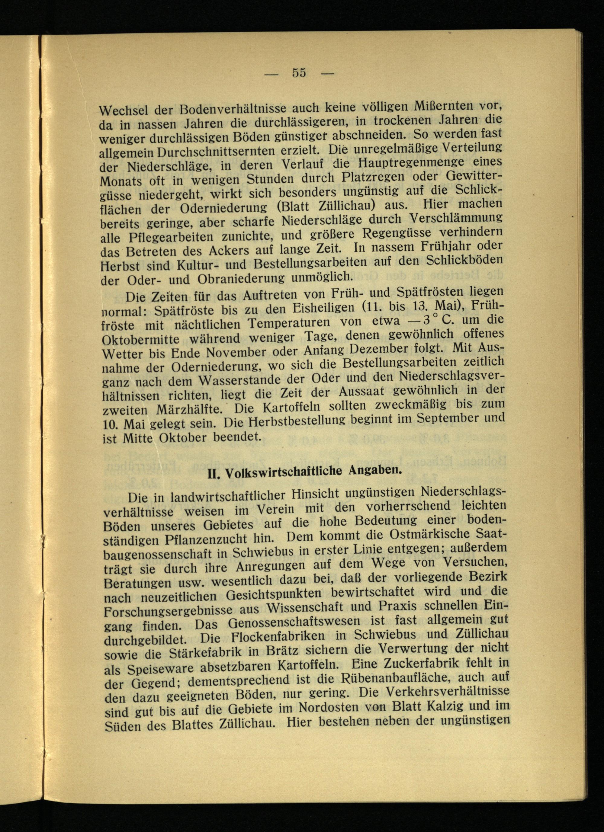 Wechsel der Bodenverhältnisse auch keine völligen Mißernten vor, da in nassen Jahren die durchlässigeren, in trockenen Jahren die weniger durchlässigen Böden günstiger abschneiden. So werden fast allgemein Durchschnittsernten erzielt. Die unregelmäßige Verteilung der Niederschläge, in deren Verlauf die Hauptregenmenge eines Monats oft in wenigen Stunden durch Platzregen oder Gewittergüsse niedergeht, wirkt sich besonders ungünstig auf die Schlickflächen der Oderniederung (Blatt Züllichau ) aus. Hier machen bereits geringe, aber scharfe Niederschläge durch Verschlämmung alle Pflegearbeiten zunichte, und größere Regengüsse verhindern das Betreten des Ackers auf lange Zeit. In nassem Frühjahr oder Herbst sind Kultur- und Bestellungsarbeiten auf den Schlickboden der Oder- und Obraniederung unmöglich.