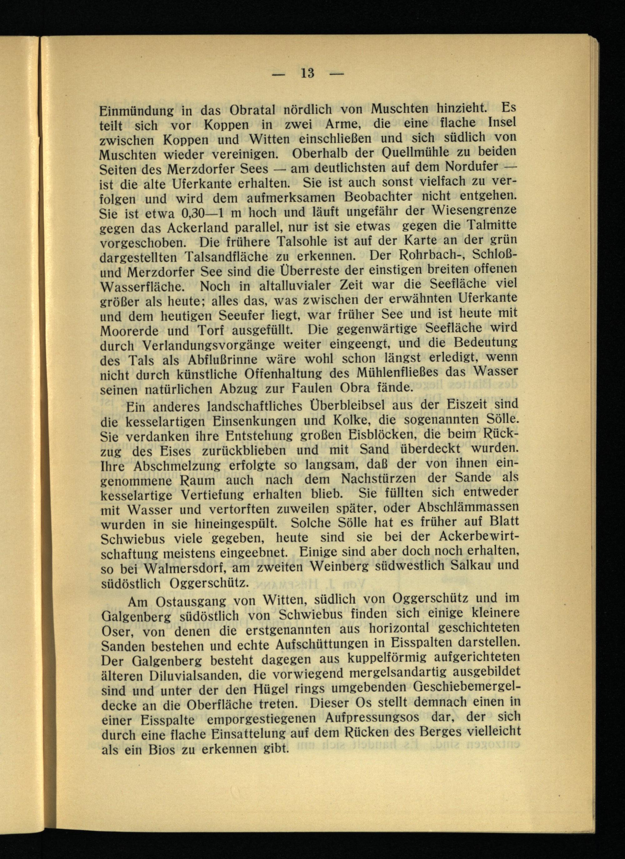 Einmündung in das Obratal nördlich von Muschten hinzieht. Es teilt sich vor Koppen in zwei Arme, die eine flache Insel zwischen Koppen und Witten einschließen und sich südlich von Muschten wieder vereinigen. Oberhalb der Quellmühle zu beiden Seiten des Merzdorfer Sees — am deutlichsten auf dem Nordufer — ist die alte Uferkante erhalten. Sie ist auch sonst vielfach zu verfolgen und wird dem aufmerksamen Beobachter nicht entgehen. Sie ist etwa 0,30—1 m hoch und läuft ungefähr der Wiesengrenze gegen das Ackerland parallel, nur ist sie etwas gegen die Talmitte vorgeschoben. Die frühere Talsohle ist auf der Karte an der grün dargestellten Talsandfläche zu erkennen. Der Rohrbach-, Schloß- und Merzdorfer See sind die Überreste der einstigen breiten offenen Wasserfläche. Noch in altalluvialer Zeit war die Seefläche viel größer als heute; alles das, was zwischen der erwähnten Uferkante und dem heutigen Seeufer liegt, war früher See und ist heute mit Moorerde und Torf ausgefüllt. Die gegenwärtige Seefläche wird durch Verlandungsvorgänge weiter eingeengt, und die Bedeutung des Tals als Abflußrinne wäre wohl schon längst erledigt, wenn nicht durch künstliche Offenhaltung des Mühlenfließes das Wasser seinen natürlichen Abzug zur Faulen Obra fände.