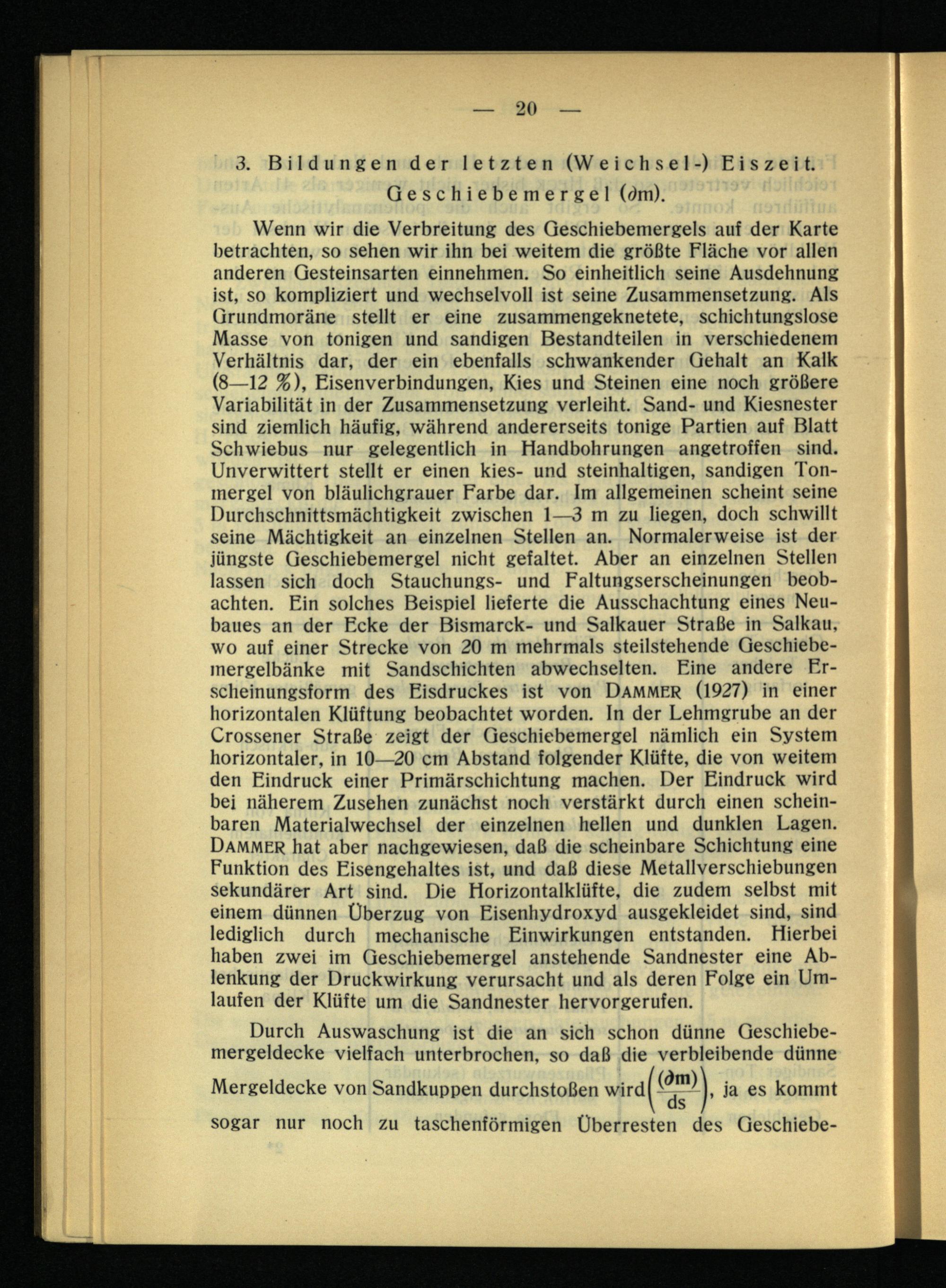 Wenn wir die Verbreitung des Geschiebemergels auf der Karte betrachten, so sehen wir ihn bei weitem die größte Fläche vor allen anderen Gesteinsarten einnehmen. So einheitlich seine Ausdehnung ist, so kompliziert und wechselvoll ist seine Zusammensetzung. Als Grundmoräne stellt er eine zusammengeknetete, schichtungslose Masse von tonigen und sandigen Bestandteilen in verschiedenem Verhältnis dar, der ein ebenfalls schwankender Gehalt an Kalk (8—12 %), Eisenverbindungen, Kies und Steinen eine noch größere Variabilität in der Zusammensetzung verleiht. Sand- und Kiesnester sind ziemlich häufig, während andererseits tonige Partien auf Blatt Schwiebus nur gelegentlich in Handbohrungen angetroffen sind. Unverwittert stellt er einen kies- und steinhaltigen, sandigen Ton- mergel von bläulichgrauer Farbe dar. Im allgemeinen scheint seine Durchschnittsmächtigkeit zwischen 1—3 m zu liegen, doch schwillt seine Mächtigkeit an einzelnen Stellen an. Normalerweise ist der jüngste Geschiebemergel nicht gefaltet. Aber an einzelnen Stellen lassen sich doch Stauchungs- und Faltungserscheinungen beobachten. Ein solches Beispiel lieferte die Ausschachtung eines Neubaues an der Ecke der Bismarck- und Salkauer Straße in Salkau, wo auf einer Strecke von 20 m mehrmals steilstehende Geschiebe- mergelbänke mit Sandschichten abwechselten. Eine andere Erscheinungsform des Eisdruckes ist von Dammer (1927) in einer horizontalen Klüftung beobachtet worden. In der Lehmgrube an der Crossener Straße zeigt der Geschiebemergel nämlich ein System horizontaler, in 10—20 cm Abstand folgender Klüfte, die von weitem den Eindruck einer Primärschichtung machen. Der Eindruck wird bei näherem Zusehen zunächst noch verstärkt durch einen scheinbaren Materialwechsel der einzelnen hellen und dunklen Lagen. Dammer hat aber nachgewiesen, daß die scheinbare Schichtung eine Funktion des Eisengehaltes ist, und daß diese Metallverschiebungen sekundärer Art sind. Die Horizontalklüfte, die zudem selbst mit einem dünnen Überzug von Eisenhydroxyd ausgekleidet sind, sind lediglich durch mechanische Einwirkungen entstanden. Hierbei haben zwei im Geschiebemergel anstehende Sandnester eine Ablenkung der Druckwirkung verursacht und als deren Folge ein Umlaufen der Klüfte um die Sandnester hervorgerufen.