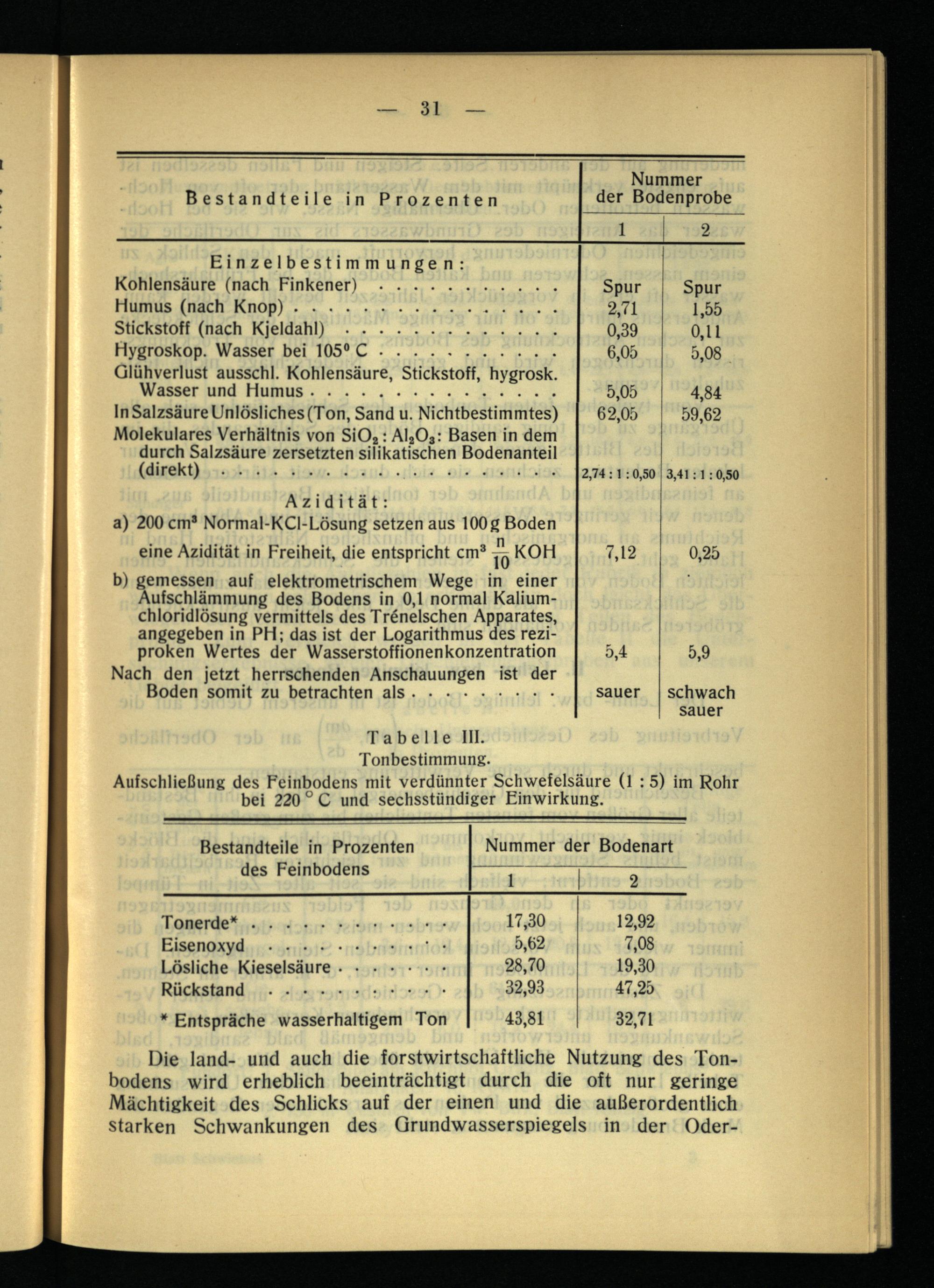 b) gemessen auf elektrometrischem Wege in einer Aufschlämmung des Bodens in 0,1 normal Kaliumchloridlösung vermittels des Trgnelschen Apparates, angegeben in PH; das ist der Logarithmus des reziproken Wertes der Wasserstoffionenkonzentration