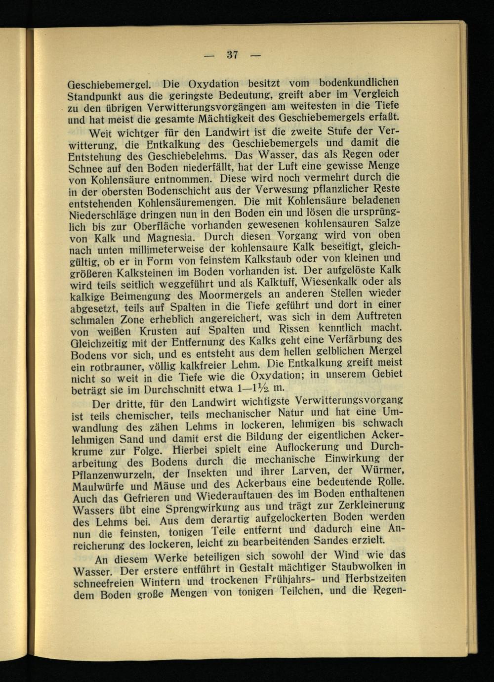 Weit wichtger für den Landwirt ist die zweite Stufe der Verwitterung, die Entkalkung des Geschiebemergels und damit die Entstehung des Geschiebelehms. Das Wasser, das als Regen oder Schnee auf den Boden niederfällt, hat der Luft eine gewisse Menge von Kohlensäure entnommen. Diese wird noch vermehrt durch die in der obersten Bodenschicht aus der Verwesung pflanzlicher Reste entstehenden Kohlensäuremengen. Die mit Kohlensäure beladenen Niederschläge dringen nun in den Boden ein und lösen die ursprünglich bis zur Oberfläche vorhanden gewesenen kohlensauren Salze von Kalk und Magnesia. Durch diesen Vorgang wird von oben nach unten millimeterweise der kohlensaure Kalk beseitigt, gleichgültig, ob er in Form von feinstem Kalkstaub oder von kleinen und größeren Kalksteinen im Boden vorhanden ist. Der aufgelöste Kalk wird teils seitlich weggeführt und als Kalktuff, Wiesenkalk oder als kalkige Beimengung des Moormergels an anderen Stellen wieder abgesetzt, teils auf Spalten in die Tiefe geführt und dort in einer schmalen Zone erheblich angereichert, was sich in dem Auftreten von weißen Krusten auf Spalten und Rissen kenntlich macht. Gleichzeitig mit der Entfernung des Kalks geht eine Verfärbung des Bodens vor sich, und es entsteht aus dem hellen gelblichen Mergel ein rotbrauner, völlig kalkfreier Lehm. Die Entkalkung greift meist nicht so weit in die Tiefe wie die Oxydation; in unserem Gebiet beträgt sie im Durchschnitt etwa 1—lVa m.