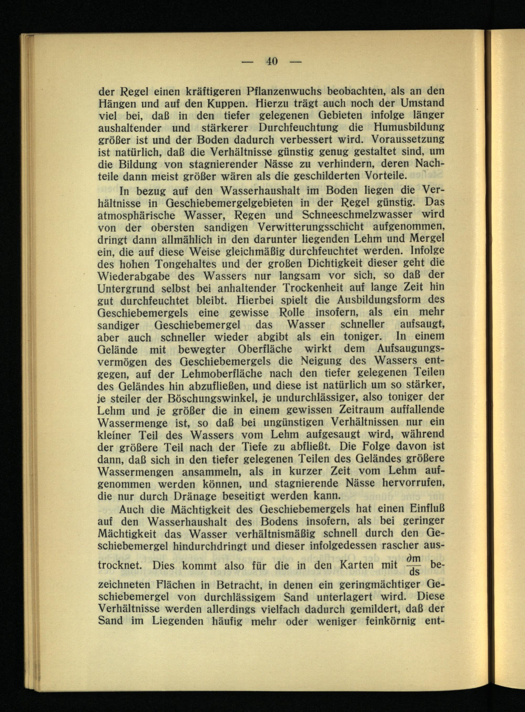 In bezug auf den Wasserhaushalt im Boden liegen die Verhältnisse in Geschiebemergelgebieten in der Regel günstig. Das atmosphärische Wasser, Regen und Schneeschmelzwasser wird von der obersten sandigen Verwitterungsschicht aufgenommen, dringt dann allmählich in den darunter liegenden Lehm und Mergel ein, die auf diese Weise gleichmäßig durchfeuchtet werden. Infolge des hohen Tongehaltes und der großen Dichtigkeit dieser geht die Wiederabgabe des Wassers nur langsam vor sich, so daß der Untergrund selbst bei anhaltender Trockenheit auf lange Zeit hin gut durchfeuchtet bleibt. Hierbei spielt die Ausbildungsform des Geschiebemergels eine gewisse Rolle insofern, als ein mehr sandiger Geschiebemergel das Wasser schneller aufsaugt, aber auch schneller wieder abgibt als ein toniger. In einem Gelände mit bewegter Oberfläche wirkt dem Aufsaugungsvermögen des Geschiebemergels die Neigung des Wassers entgegen, auf der Lehmoberfläche nach den tiefer gelegenen Teilen des Geländes hin abzufließen, und diese ist natürlich um so stärker, je steiler der Böschungswinkel, je undurchlässiger, also toniger der Lehm und je größer die in einem gewissen Zeitraum auffallende Wassermenge ist, so daß bei ungünstigen Verhältnissen nur ein kleiner Teil des Wassers vom Lehm aufgesaugt wird, während der größere Teil nach der Tiefe zu abfließt. Die Folge davon ist dann, daß sich in den tiefer gelegenen Teilen des Geländes größere Wassermengen ansammeln, als in kurzer Zeit vom Lehm aufgenommen werden können, und stagnierende Nässe hervorrufen, die nur durch Dränage beseitigt werden kann.