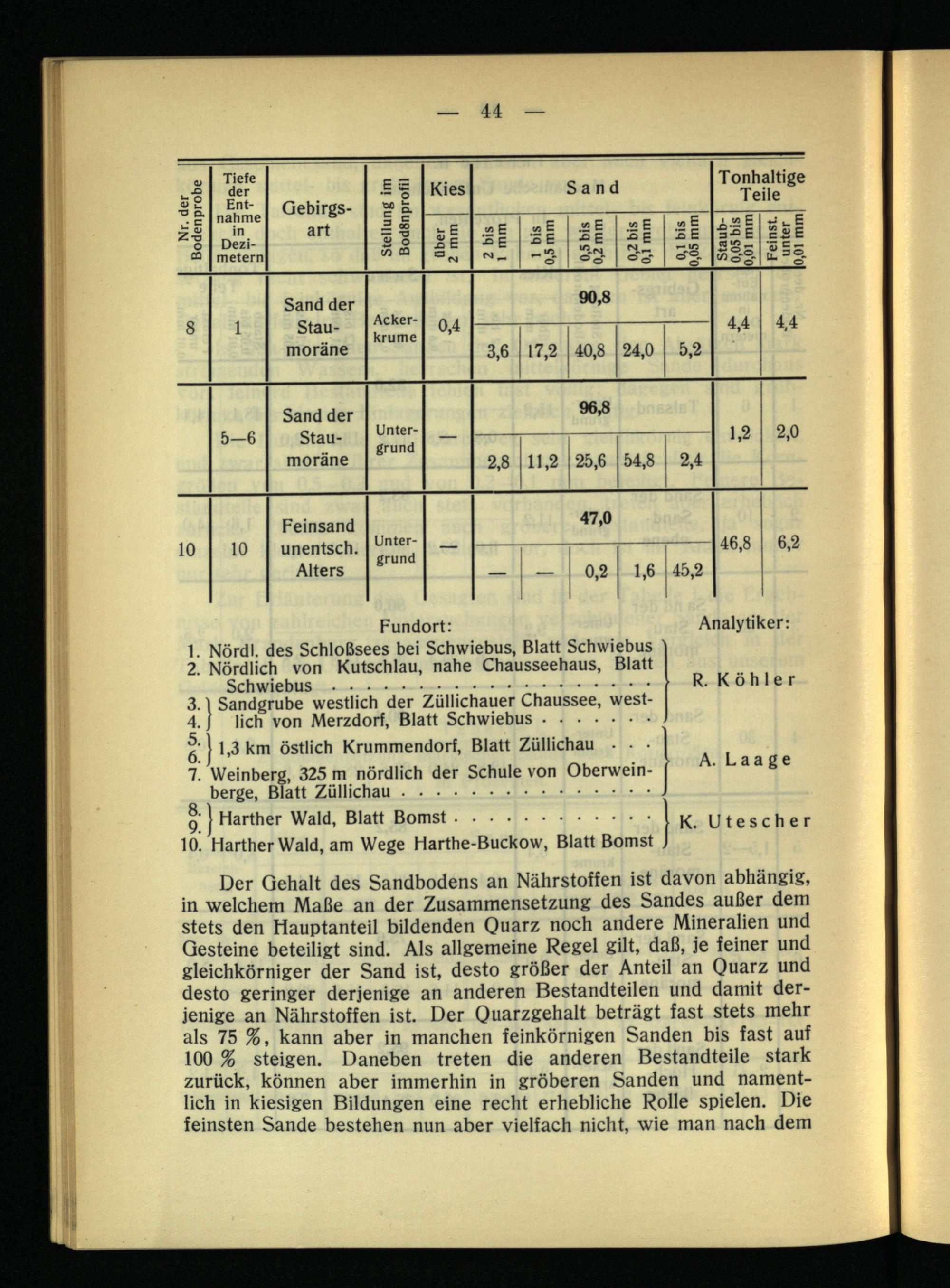 Der Gehalt des Sandbodens an Nährstoffen ist davon abhängig, in welchem Maße an der Zusammensetzung des Sandes außer dem stets den Hauptanteil bildenden Quarz noch andere Mineralien und Gesteine beteiligt sind. Als allgemeine Regel gilt, daß, je feiner und gleichkörniger der Sand ist, desto größer der Anteil an Quarz und desto geringer derjenige an anderen Bestandteilen und damit derjenige an Nährstoffen ist. Der Quarzgehalt beträgt fast stets mehr als 75 %, kann aber in manchen feinkörnigen Sanden bis fast auf 100 % steigen. Daneben treten die anderen Bestandteile stark zurück, können aber immerhin in gröberen Sanden und namentlich in kiesigen Bildungen eine recht erhebliche Rolle spielen. Die feinsten Sande bestehen nun aber vielfach nicht, wie man nach dem