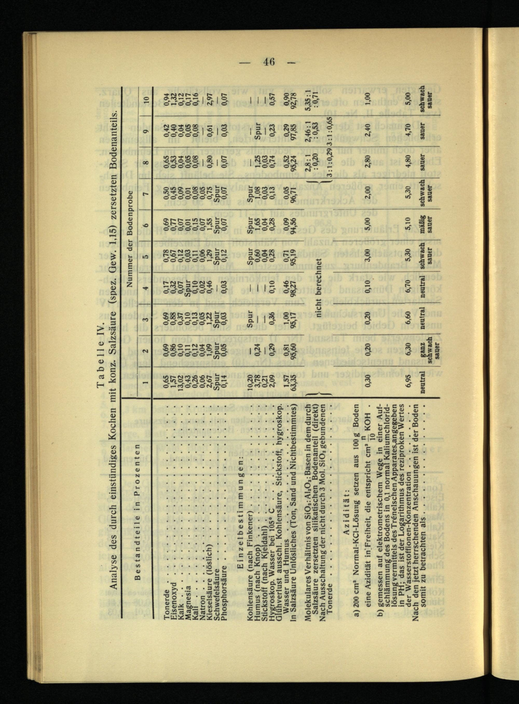 In Salzsäure Unlösliches( Ton, Sand und Nichtbestimmtes) Molekulares Verhältnis von SiO2: Al₂O: Basen in dem durch Salzsäure zersetzten silikatischen Bodenanteil( direkt) Nach Ausschaltung der nicht durch 3 Mol. SiO, gebundenen Tonerde