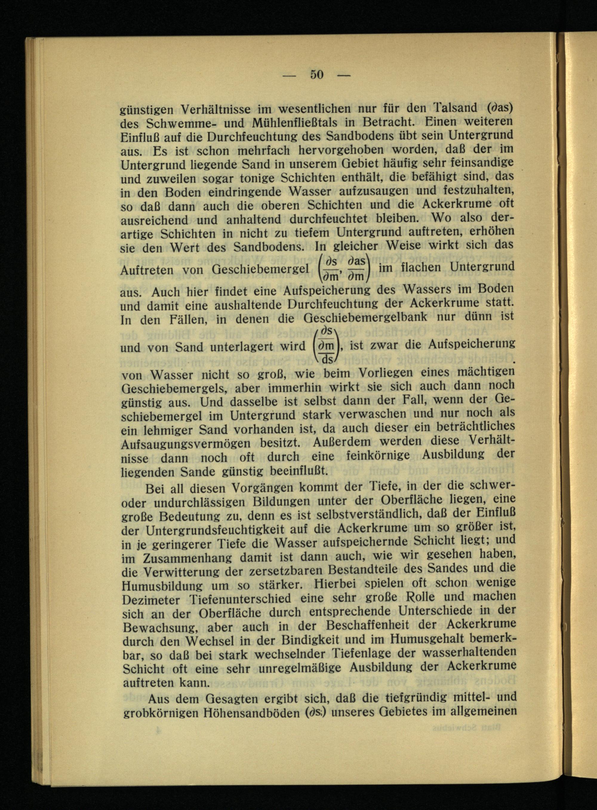 günstigen Verhältnisse im wesentlichen nur für den Talsand (das) des Schwemme- und Mühlenfließtals in Betracht. Einen weiteren Einfluß auf die Durchfeuchtung des Sandbodens übt sein Untergrund aus. Es ist schon mehrfach hervorgehoben worden, daß der im Untergrund liegende Sand in unserem Gebiet häufig sehr feinsandige und zuweilen sogar tonige Schichten enthält, die befähigt sind, das in den Boden eindringende Wasser aufzusaugen und festzuhalten, so daß dann auch die oberen Schichten und die Ackerkrume oft ausreichend und anhaltend durchfeuchtet bleiben. Wo also derartige Schichten in nicht zu tiefem Untergrund auftreten, erhöhen sie den Wert des Sandbodens. In gleicher Weise wirkt sich das
