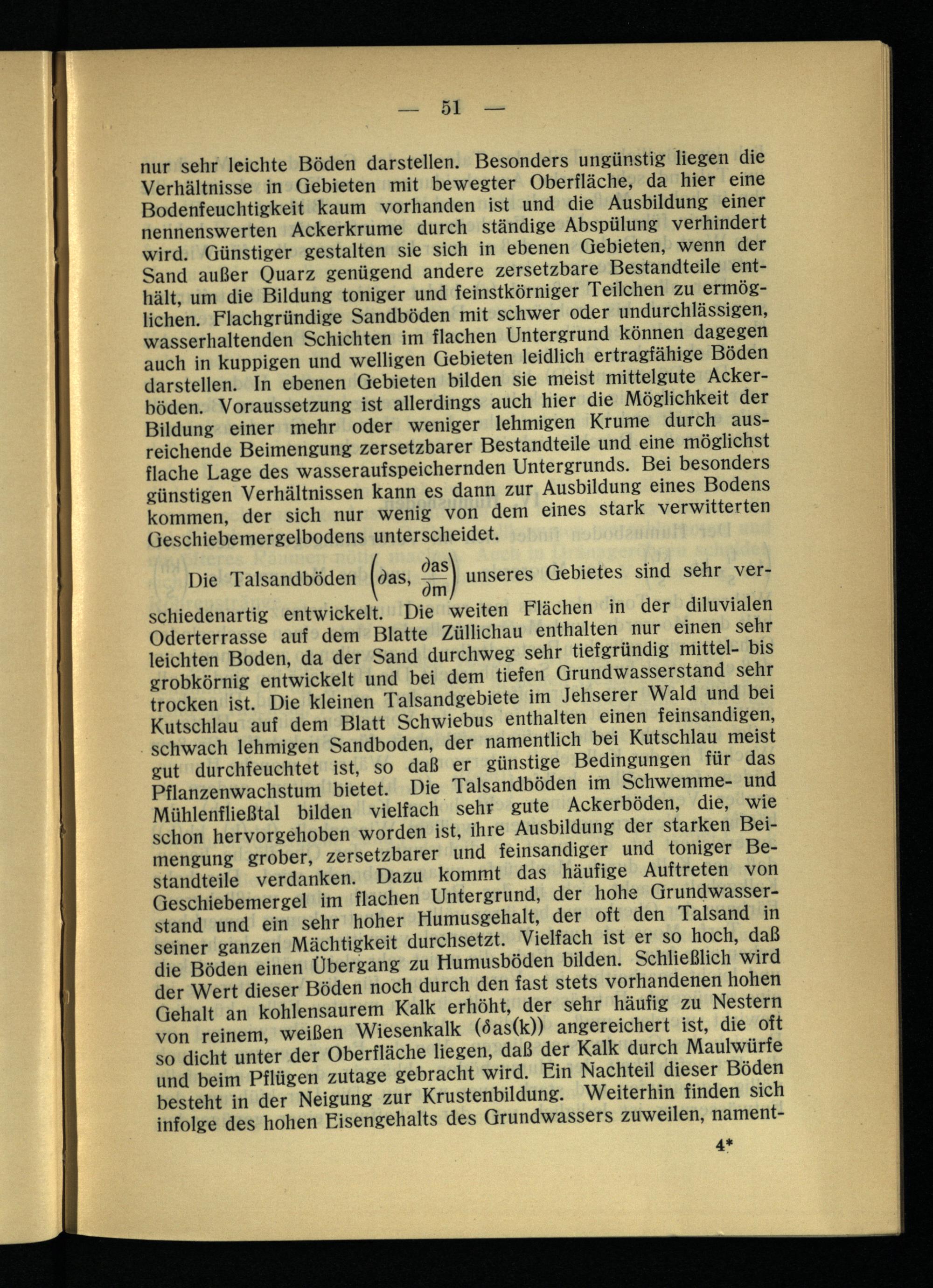 schiedenartig entwickelt. Die weiten Flächen in der diluvialen Oderterrasse auf dem Blatte Züllichau enthalten nur einen sehr leichten Boden, da der Sand durchweg sehr tiefgründig mittel- bis grobkörnig entwickelt und bei dem tiefen Grundwasserstand sehr trocken ist. Die kleinen Talsandgebiete im Jehserer Wald und bei Kutschlau auf dem Blatt Schwiebus enthalten einen feinsandigen, schwach lehmigen Sandboden, der namentlich bei Kutschlau meist gut durchfeuchtet ist, so daß er günstige Bedingungen für das Pflanzenwachstum bietet. Die Talsandböden im Schwemme- und Mühlenfließtal bilden vielfach sehr gute Ackerböden, die, wie schon hervorgehoben worden ist, ihre Ausbildung der starken Beimengung grober, zersetzbarer und feinsandiger und toniger Bestandteile verdanken. Dazu kommt das häufige Auftreten von Geschiebemergel im flachen Untergrund, der hohe Grundwasserstand und ein sehr hoher Humusgehalt, der oft den Talsand in seiner ganzen Mächtigkeit durchsetzt. Vielfach ist er so hoch, daß die Böden einen Übergang zu Humusböden bilden. Schließlich wird der Wert dieser Böden noch durch den fast stets vorhandenen hohen Gehalt an kohlensaurem Kalk erhöht, der sehr häufig zu Nestern von reinem, weißen Wiesenkalk (<5as(k)) angereichert ist, die oft so dicht unter der Oberfläche liegen, daß der Kalk durch Maulwürfe und beim Pflügen zutage gebracht wird. Ein Nachteil dieser Böden besteht in der Neigung zur Krustenbildung. Weiterhin finden sich infolge des hohen Eisengehalts des Grundwassers zuweilen, nament-
