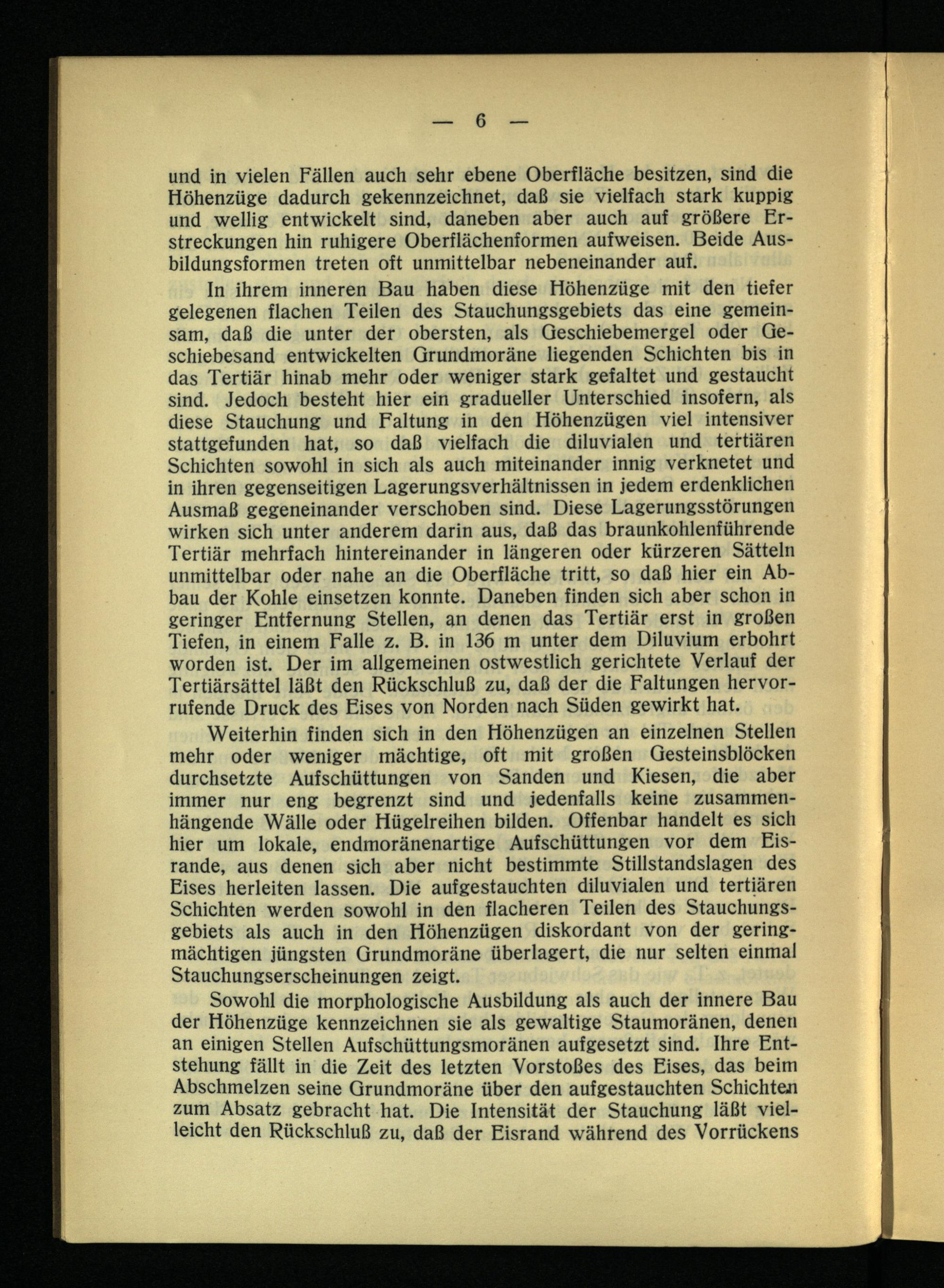In ihrem inneren Bau haben diese Höhenzüge mit den tiefer gelegenen flachen Teilen des Stauchungsgebiets das eine gemeinsam, daß die unter der obersten, als Geschiebemergel oder Geschiebesand entwickelten Grundmoräne liegenden Schichten bis in das Tertiär hinab mehr oder weniger stark gefaltet und gestaucht sind. Jedoch besteht hier ein gradueller Unterschied insofern, als diese Stauchung und Faltung in den Höhenzügen viel intensiver stattgefunden hat, so daß vielfach die diluvialen und tertiären Schichten sowohl in sich als auch miteinander innig verknetet und in ihren gegenseitigen Lagerungsverhältnissen in jedem erdenklichen Ausmaß gegeneinander verschoben sind. Diese Lagerungsstörungen wirken sich unter anderem darin aus, daß das braunkohlenführende Tertiär mehrfach hintereinander in längeren oder kürzeren Sätteln unmittelbar oder nahe an die Oberfläche tritt, so daß hier ein Abbau der Kohle einsetzen konnte. Daneben finden sich aber schon in geringer Entfernung Stellen, an denen das Tertiär erst in großen Tiefen, in einem Falle z. B. in 136 m unter dem Diluvium erbohrt worden ist. Der im allgemeinen ostwestlich gerichtete Verlauf der Tertiärsättel läßt den Rückschluß zu, daß der die Faltungen hervorrufende Druck des Eises von Norden nach Süden gewirkt hat.