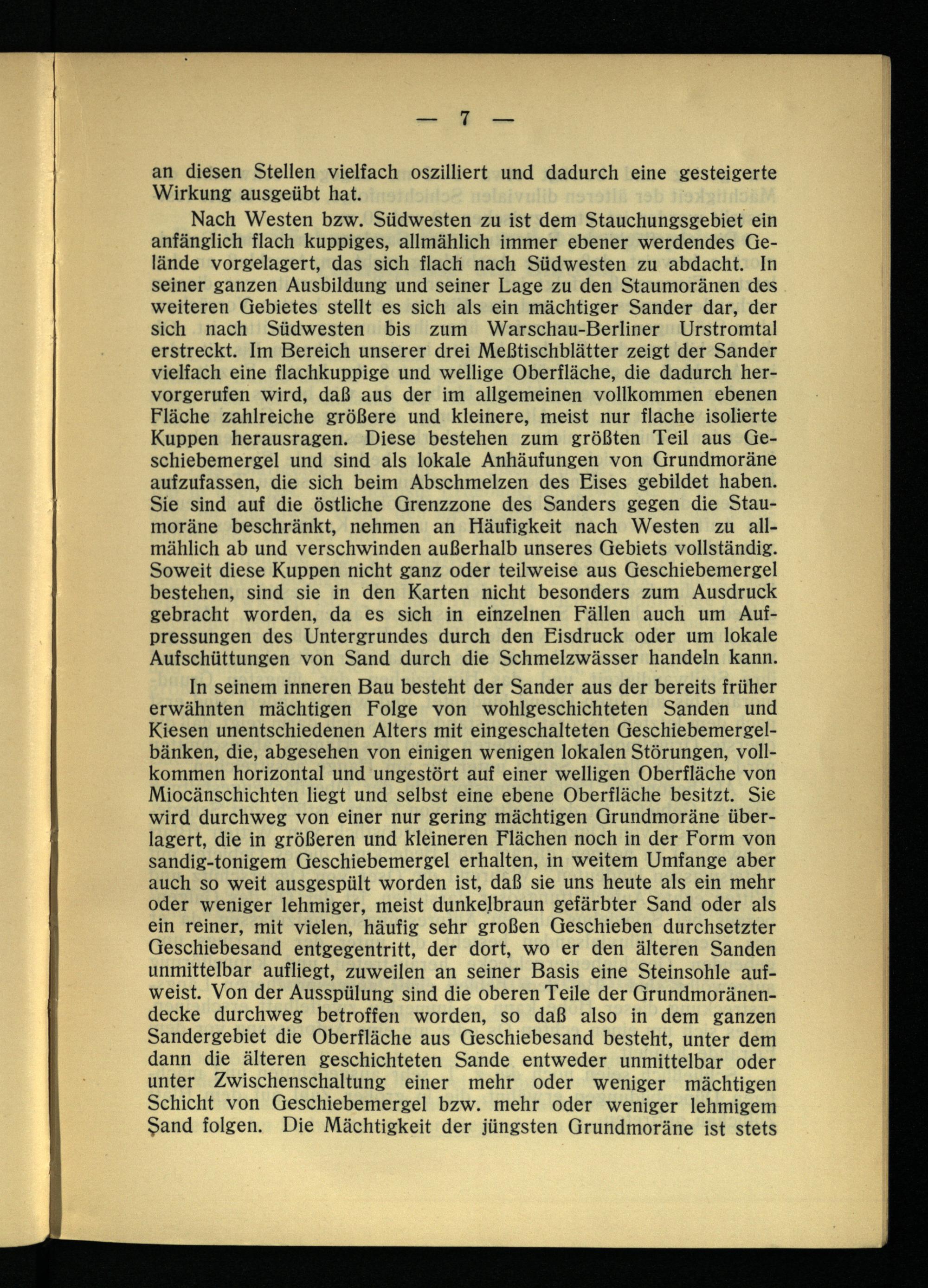 Nach Westen bzw. Südwesten zu ist dem Stauchungsgebiet ein anfänglich flach kuppiges, allmählich immer ebener werdendes Gelände vorgelagert, das sich flach nach Südwesten zu abdacht. In seiner ganzen Ausbildung und seiner Lage zu den Staumoränen des weiteren Gebietes stellt es sich als ein mächtiger Sander dar, der sich nach Südwesten bis zum Warschau-Berliner Urstromtal erstreckt. Im Bereich unserer drei Meßtischblätter zeigt der Sander vielfach eine flachkuppige und wellige Oberfläche, die dadurch hervorgerufen wird, daß aus der im allgemeinen vollkommen ebenen Fläche zahlreiche größere und kleinere, meist nur flache isolierte Kuppen herausragen. Diese bestehen zum größten Teil aus Geschiebemergel und sind als lokale Anhäufungen von Grundmoräne aufzufassen, die sich beim Abschmelzen des Eises gebildet haben. Sie sind auf die östliche Grenzzone des Sanders gegen die Staumoräne beschränkt, nehmen an Häufigkeit nach Westen zu allmählich ab und verschwinden außerhalb unseres Gebiets vollständig. Soweit diese Kuppen nicht ganz oder teilweise aus Geschiebemergel bestehen, sind sie in den Karten nicht besonders zum Ausdruck gebracht worden, da es sich in einzelnen Fällen auch um Aufpressungen des Untergrundes durch den Eisdruck oder um lokale Aufschüttungen von Sand durch die Schmelzwässer handeln kann.