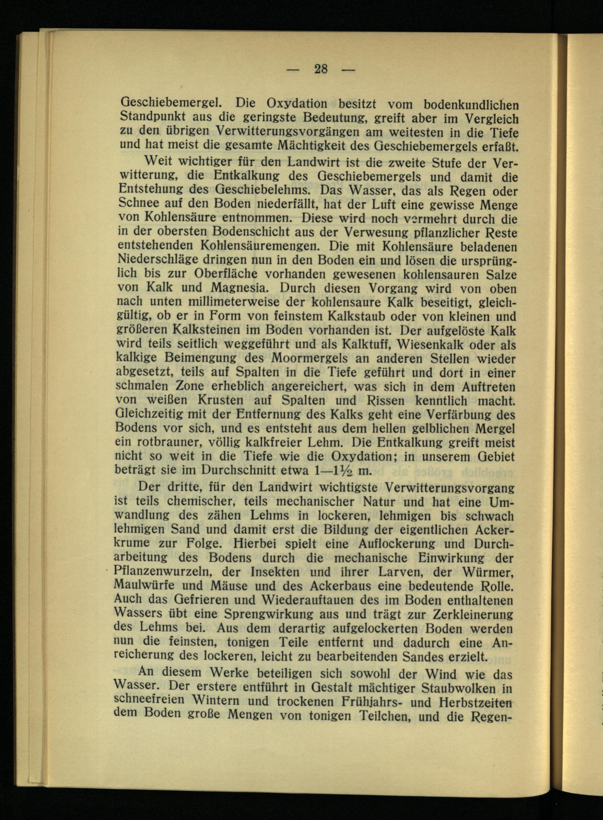 Weit wichtiger für den Landwirt ist die zweite Stufe der Verwitterung, die Entkalkung des Geschiebemergels und damit die Entstehung des Geschiebelehms. Das Wasser, das als Regen oder Schnee auf den Boden niederfällt, hat der Luft eine gewisse Menge von Kohlensäure entnommen. Diese wird noch vermehrt durch die in der obersten Bodenschicht aus der Verwesung pflanzlicher Reste entstehenden Kohlensäuremengen. Die mit Kohlensäure beladenen Niederschläge dringen nun in den Boden ein und lösen die ursprünglich bis zur Oberfläche vorhanden gewesenen kohlensauren Salze von Kalk und Magnesia. Durch diesen Vorgang wird von oben nach unten millimeterweise der kohlensaure Kalk beseitigt, gleichgültig, ob er in Form von feinstem Kalkstaub oder von kleinen und größeren Kalksteinen im Boden vorhanden ist. Der aufgelöste Kalk wird teils seitlich weggeführt und als Kalktuff, Wiesenkalk oder als kalkige Beimengung des Moormergels an anderen Stellen wieder abgesetzt, teils auf Spalten in die Tiefe geführt und dort in einer schmalen Zone erheblich angereichert, was sich in dem Auftreten von weißen Krusten auf Spalten und Rissen kenntlich macht. Gleichzeitig mit der Entfernung des Kalks geht eine Verfärbung des Bodens vor sich, und es entsteht aus dem hellen gelblichen Mergel ein rotbrauner, völlig kalkfreier Lehm. Die Entkalkung greift meist nicht so weit in die Tiefe wie die Oxydation; in unserem Gebiet beträgt sie im Durchschnitt etwa 1—1% m.