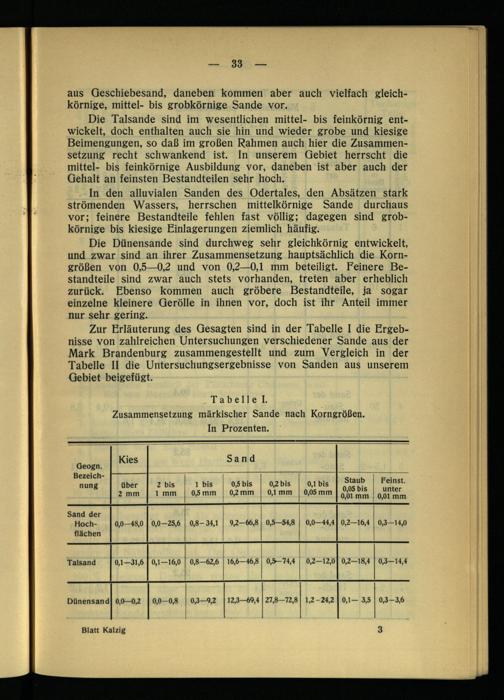 Zur Erläuterung des Gesagten sind in der Tabelle I die Ergebnisse von zahlreichen Untersuchungen verschiedener Sande aus der Mark Brandenburg zusammengestellt und zum Vergleich in der Tabelle II die Untersuchungsergebnisse von Sanden aus unserem Gebiet beigefügt.