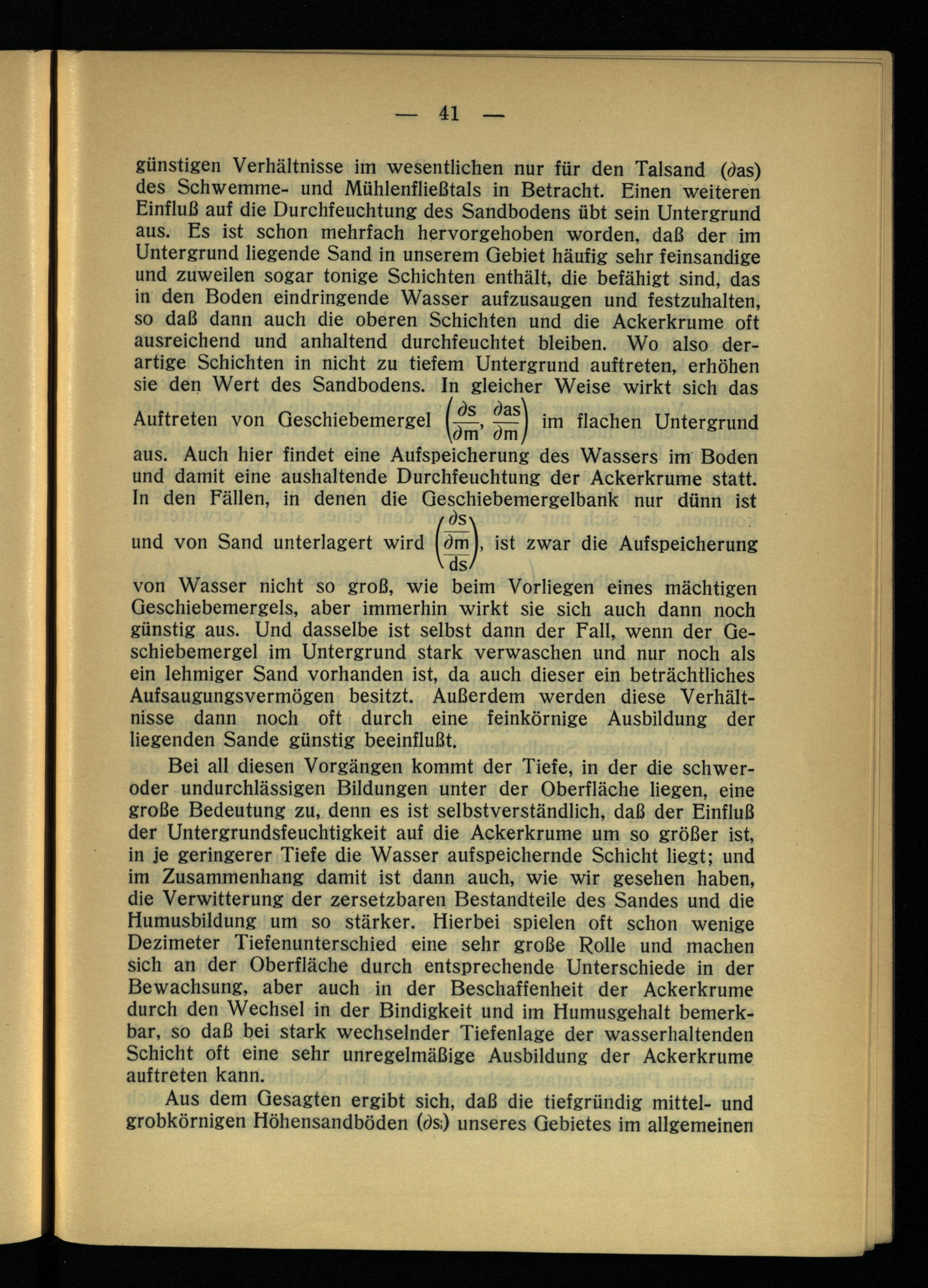 günstigen Verhältnisse im wesentlichen nur für den Talsand (das) des Schwemme- und Mühlenfließtals in Betracht. Einen weiteren Einfluß auf die Durchfeuchtung des Sandbodens übt sein Untergrund aus. Es ist schon mehrfach hervorgehoben worden, daß der im Untergrund liegende Sand in unserem Gebiet häufig sehr feinsandige und zuweilen sogar tonige Schichten enthält, die befähigt sind, das in den Boden eindringende Wasser aufzusaugen und festzuhalten, so daß dann auch die oberen Schichten und die Ackerkrume oft ausreichend und anhaltend durchfeuchtet bleiben. Wo also derartige Schichten in nicht zu tiefem Untergrund auftreten, erhöhen sie den Wert des Sandbodens. In gleicher Weise wirkt sich das