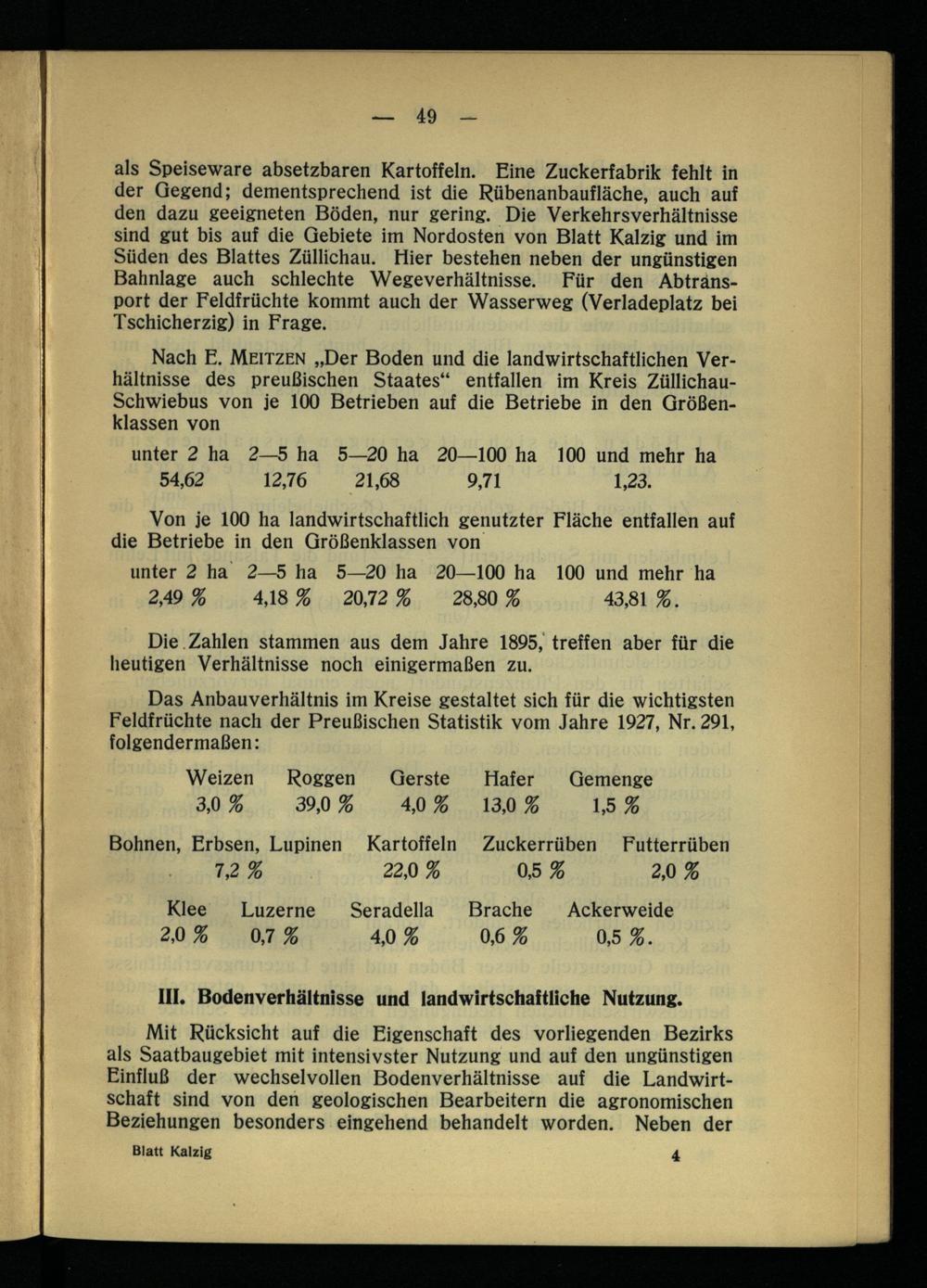 als Speiseware absetzbaren Kartoffeln. Eine Zuckerfabrik fehlt in der Gegend; dementsprechend ist die Rübenanbaufläche, auch auf den dazu geeigneten Böden, nur gering. Die Verkehrsverhältnisse sind gut bis auf die Gebiete im Nordosten von Blatt Kalzig und im Süden des Blattes Züllichau . Hier bestehen neben der ungünstigen Bahnlage auch schlechte Wegeverhältnisse. Für den Abtransport der Feldfrüchte kommt auch der Wasserweg (Verladeplatz bei Tschicherzig) in Frage.