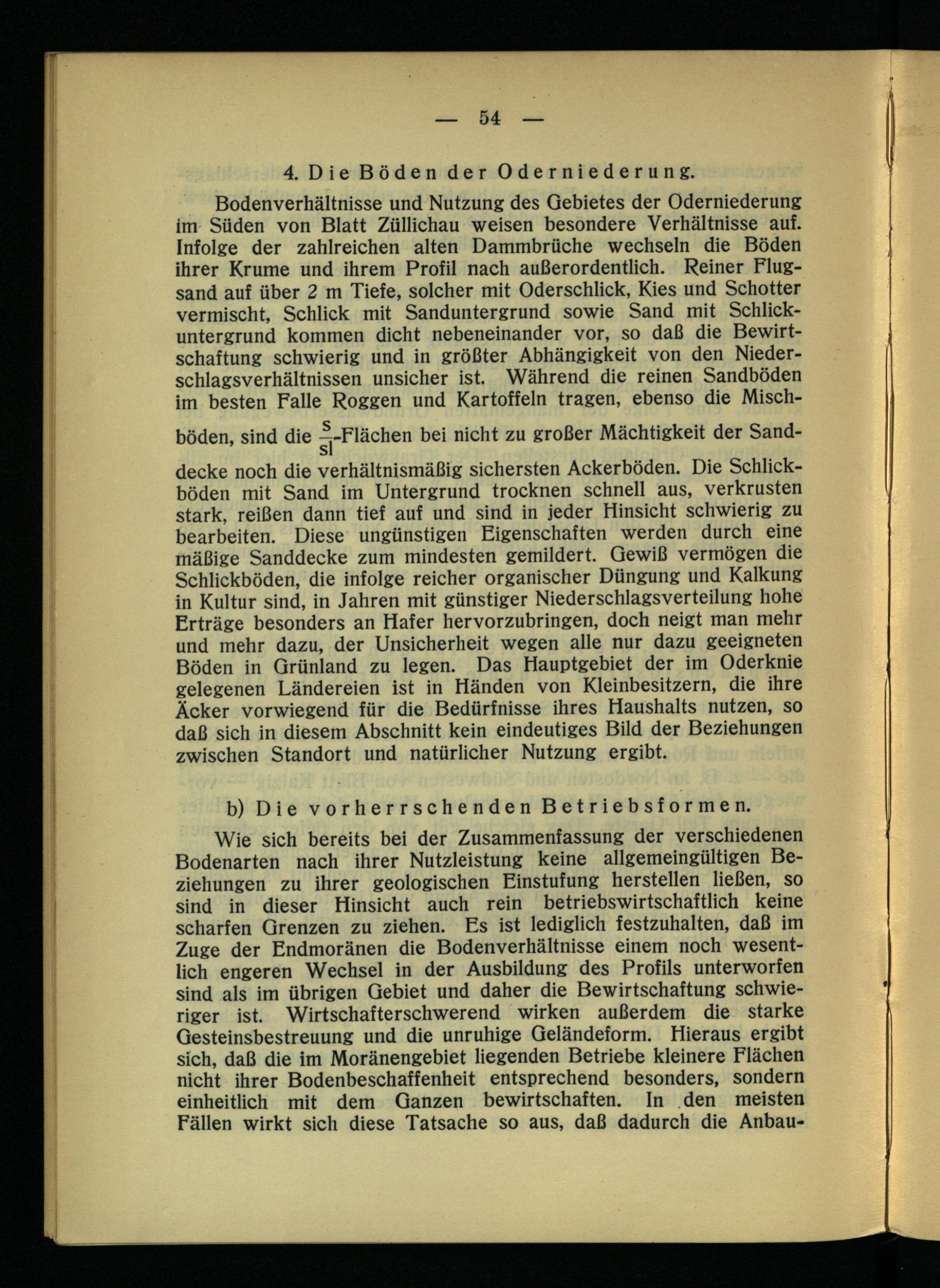 Bodenverhältnisse und Nutzung des Gebietes der Oderniederung im Süden von Blatt Züllichau weisen besondere Verhältnisse auf. Infolge der zahlreichen alten Dammbrüche wechseln die Böden ihrer Krume und ihrem Profil nach außerordentlich. Reiner Flugsand auf über 2 m Tiefe, solcher mit Oderschlick, Kies und Schotter vermischt, Schlick mit Sanduntergrund sowie Sand mit Schlickuntergrund kommen dicht nebeneinander vor, so daß die Bewirtschaftung schwierig und in größter Abhängigkeit von den Niederschlagsverhältnissen unsicher ist. Während die reinen Sandböden im besten Falle Roggen und Kartoffeln tragen, ebenso die Mischböden, sind die 4-Flächen bei nicht zu großer Mächtigkeit der Sand- sl