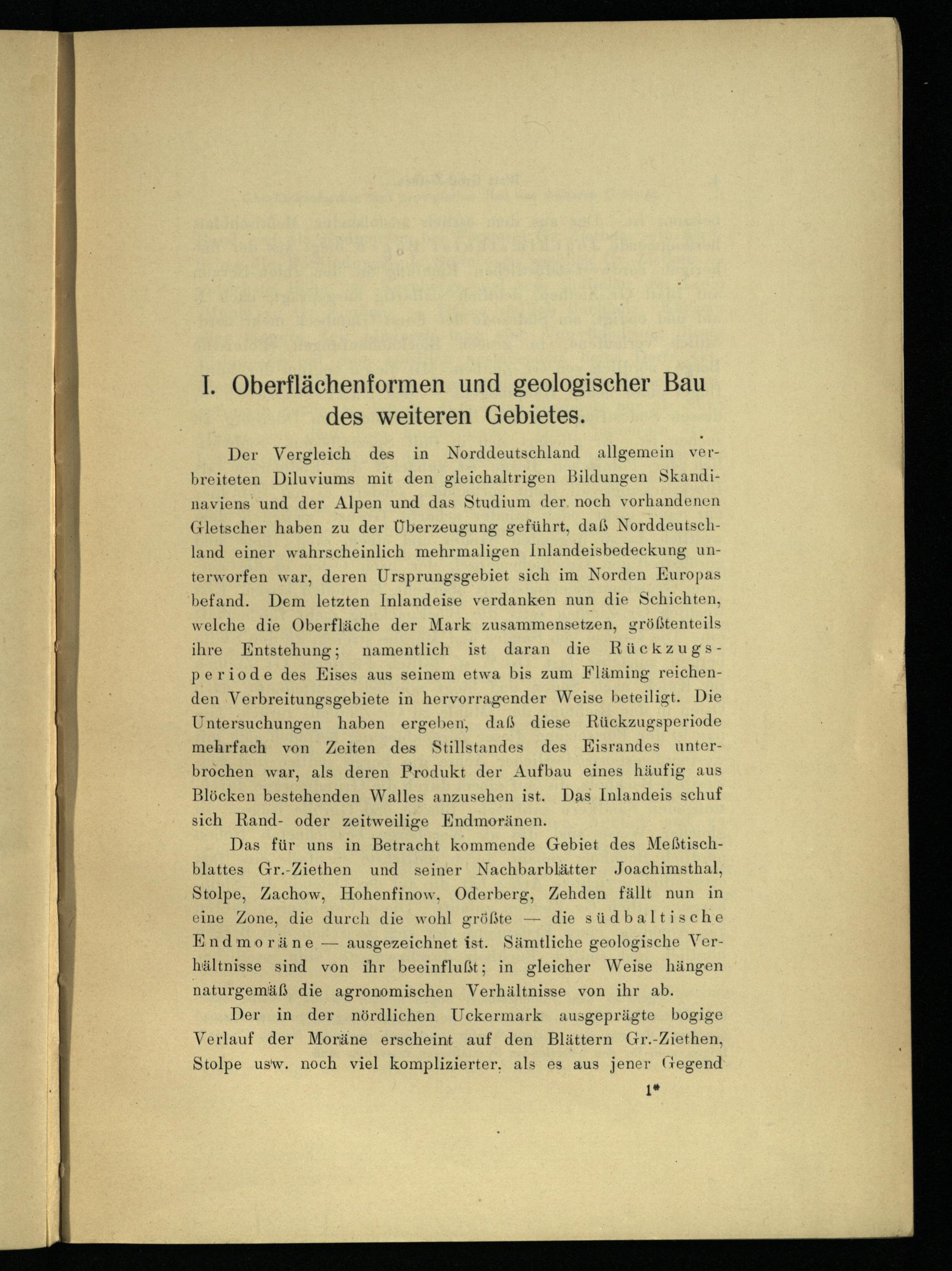 Der Vergleich des in Norddeutschland allgemein verbreiteten Diluviums mit den gleichaltrigen Bildungen Skandi naviens und der Alpen und das Studium der noch vorhandenen Gletscher haben zu der Überzeugung geführt, daß Norddeutschland einer wahrscheinlich mehrmaligen Inlandeisbedeckung unterworfen war, deren Ursprungsgebiet sich im Norden Europas befand. Dem letzten Inlandeise verdanken nun die Schichten, welche die Oberfläche der Mark zusammensetzen, größtenteils ihre Entstehung; namentlich ist daran die Rückzugs- periode des Eises aus seinem etwa bis zum Fläming reichenden Verbreitungsgebiete in hervorragender Weise beteiligt. Die Untersuchungen haben ergeben, daß diese Rückzugsperiode mehrfach von Zeiten des Stillstandes des Eisrandes unterbrochen war, als deren Produkt der Aufbau eines häufig aus Blöcken bestehenden Walles anzusehen ist. Das Inlandeis schuf sich Rand- oder zeitweilige Endmoränen.