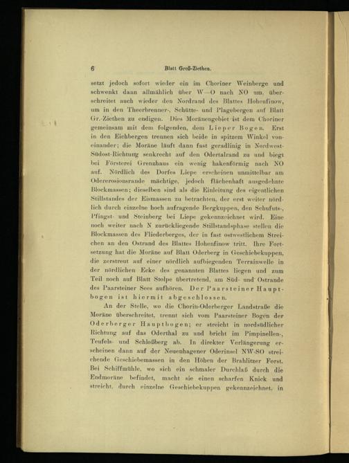 setzt jedoch sofort wieder ein im Choriner Weinberge und schwenkt dann allmählich über W—0 nach NO um, überschreitet auch wieder den Kordrand des Blattes Hohenfinow , um in den Theerbrenner-, Schütte- und Plagebergen auf Blatt Gr.-Ziethen zu endigen. Dies Moränengebiet ist dem Choriner gemeinsam mit dem folgenden, dem Lieper Bogen. Erst in den Eichbergen trennen sich beide in spitzem Winkel voneinander; die Moräne läuft dann fast geradlinig in Nordwest- Südost-Richtung senkrecht auf den Odertalrand zu und biegt bei Försterei Grenzhaus ein wenig hakenförmig nach NO auf. Nördlich des Dorfes Liepe erscheinen unmittelbar am Odererosionsrande mächtige, jedoch flächenhaft ausgedehnte Blockmassen; dieselben sind als die Einleitung des eigentlichen Stillstandes der Eismassen zu betrachten, der erst weiter nördlich durch einzelne hoch aufragende Bergkuppen, den Schufuts-, Pfingst- und Steinberg bei Liepe gekennzeichnet wird. Eine noch weiter nach N zurückliegende Stillstandsphase stellen die Blockmassen des Fliederberges, der in fast ostwestlichem Streichen an den Ostrand des Blattes Hohenfinow tritt. Ihre Fortsetzung hat die Moräne auf Blatt Oderberg in Geschiebekuppen, die zerstreut auf einer nördlich aufbiegenden Terrainwelle in der nördlichen Ecke des genannten Blattes liegen und zum Teil noch auf Blatt Stolpe übertretend, am Süd- und Ostrande des Paarsteiner Sees aufhören. Der Paarsteiner Haupt- bogen ist hiermit abgeschlossen.