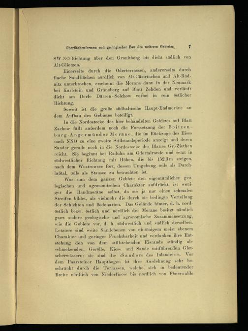 Einerseits durch die Oderterrassen, andererseits durch flache Sandflächen nördlich von Alt-Cüstrinchen und Alt-Rüdnitz unterbrochen, erscheint die Moräne dann in der Neumark bei Karlstein und Grüneberg auf Blatt Zehden und verläuft dicht am Dorfe Dürren - Selchow vorbei in rein östlicher Richtung.